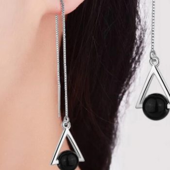 Victoria’s Vogue Beautiful Triangle Geometric 925 Sterling Silver Jewelry Long Exaggerated Natural Black Crystal Tassel Dangle Earrings