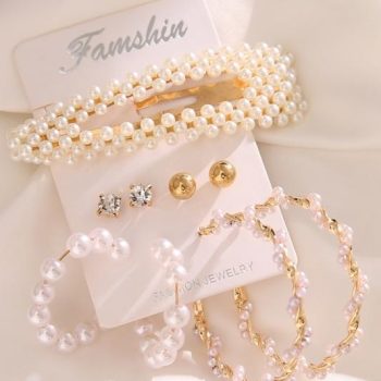 victoria’s vogue Fashion Imitation Pearl Brinco Earring Set For Women’s Vintage Golden Hair Clip Pearl Dangle Earrings Boho Gift Set