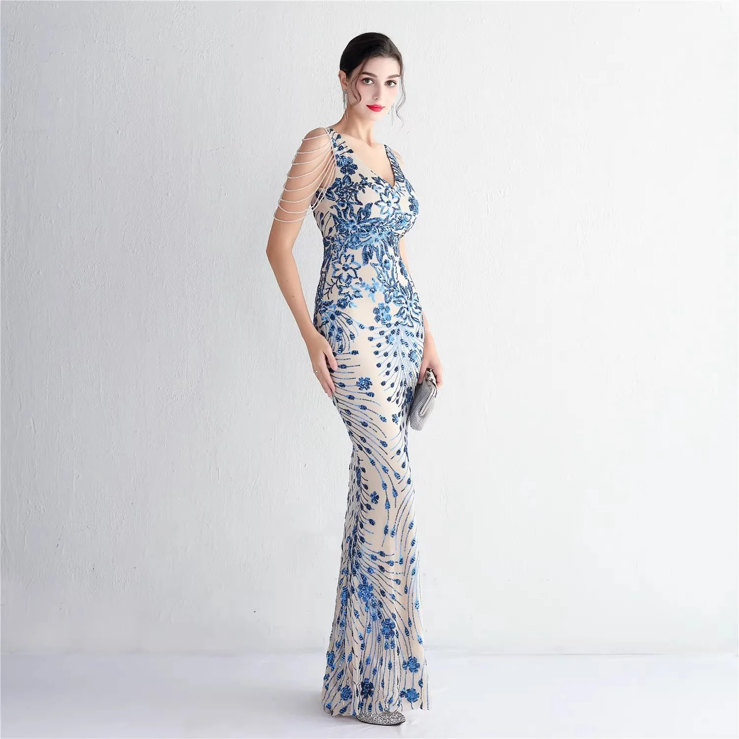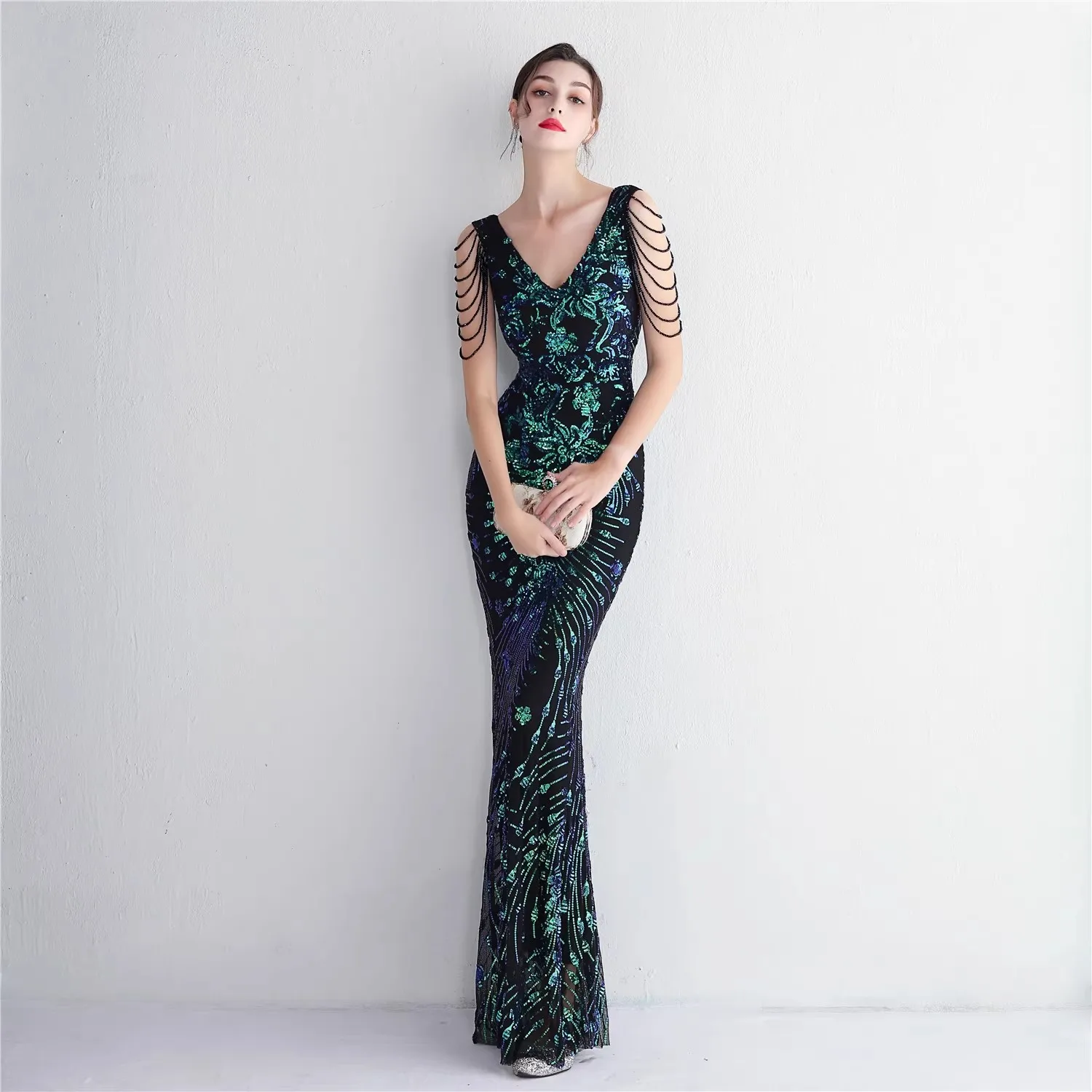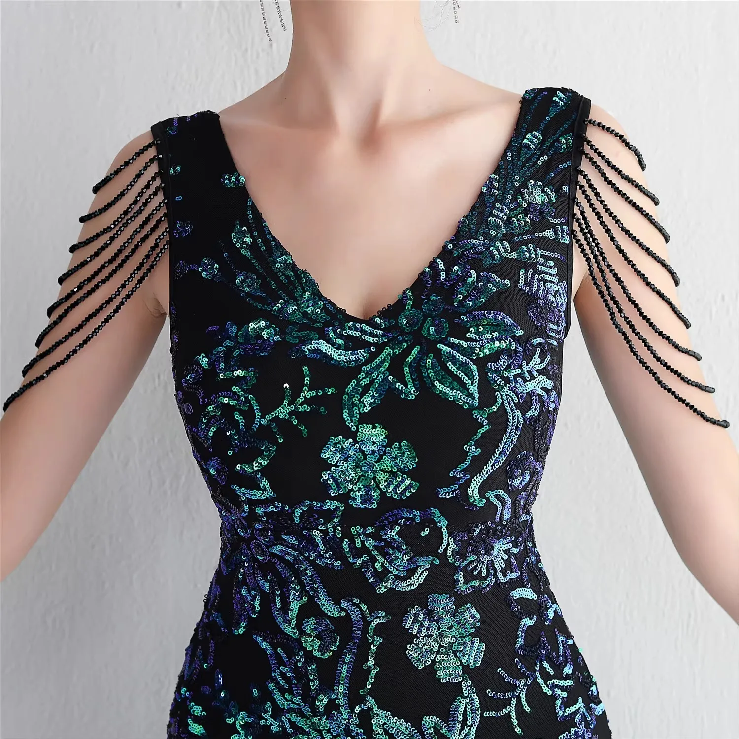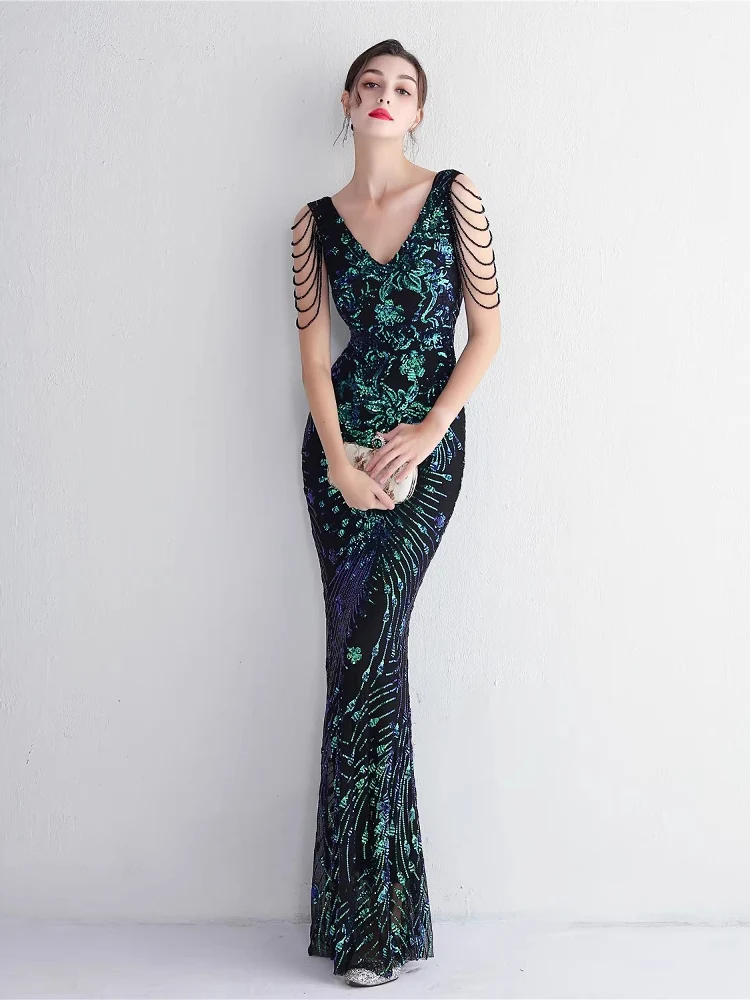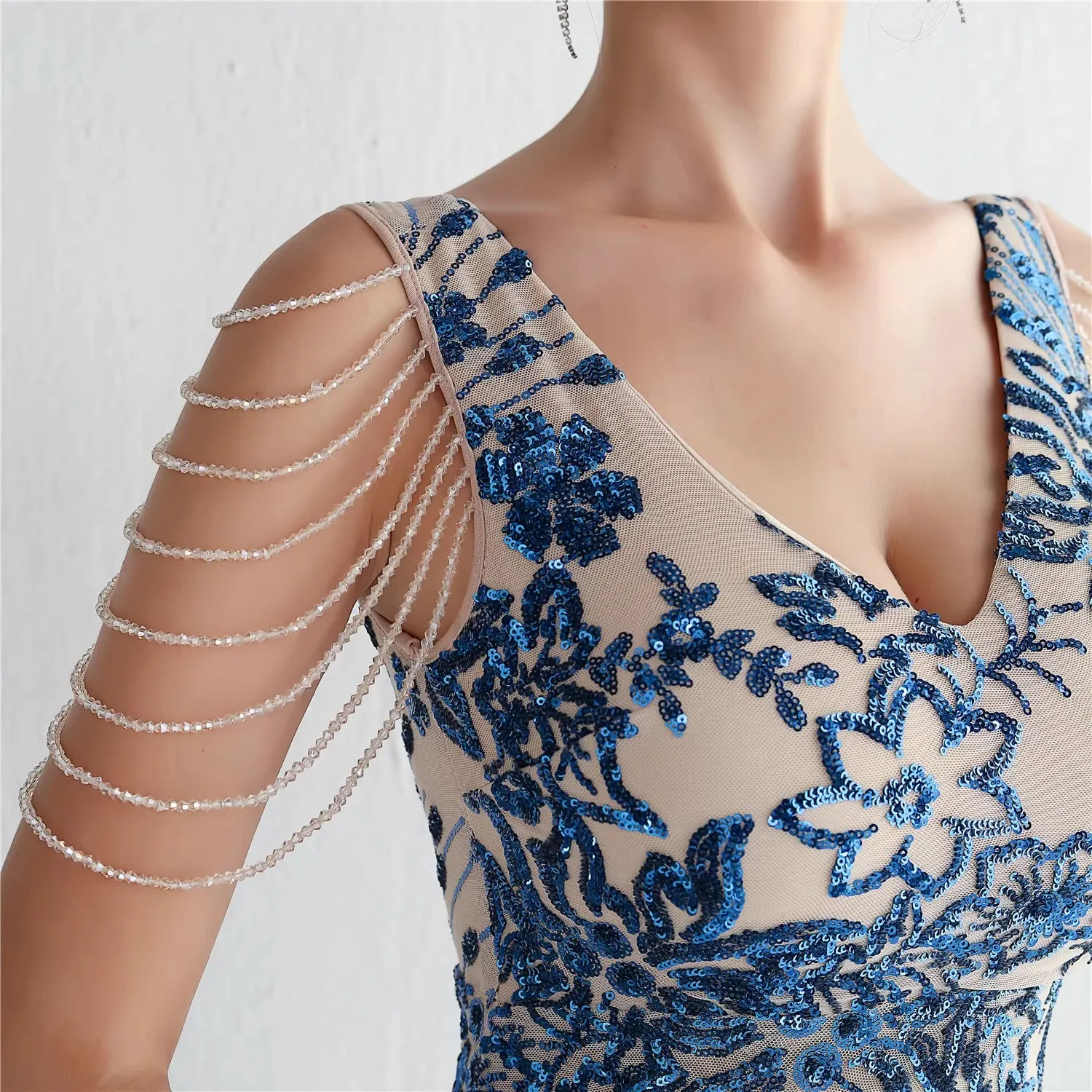 victoria’svogue Sequins Evening Dress For Women 2025 Deep V-neck Satin Prom Party Green Dress Floor Length Blue Formal Gown