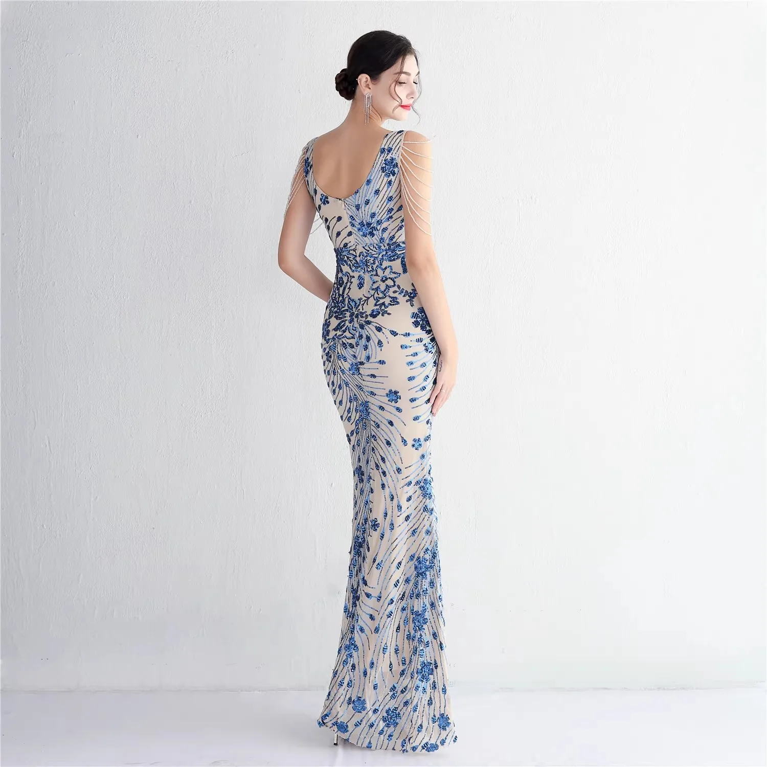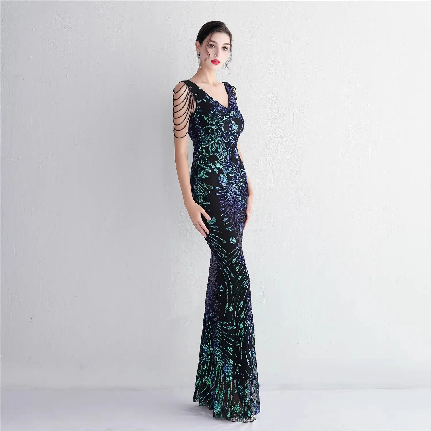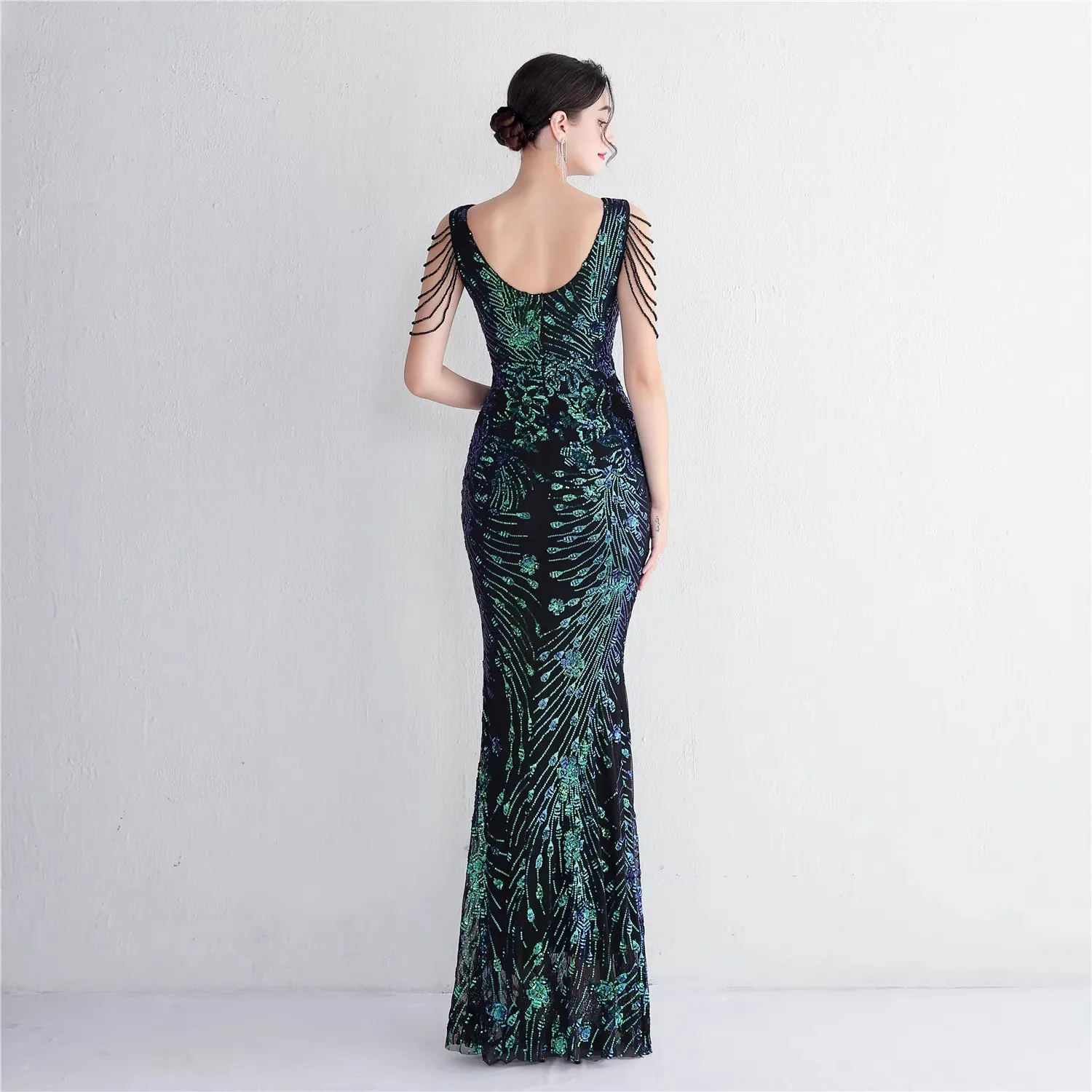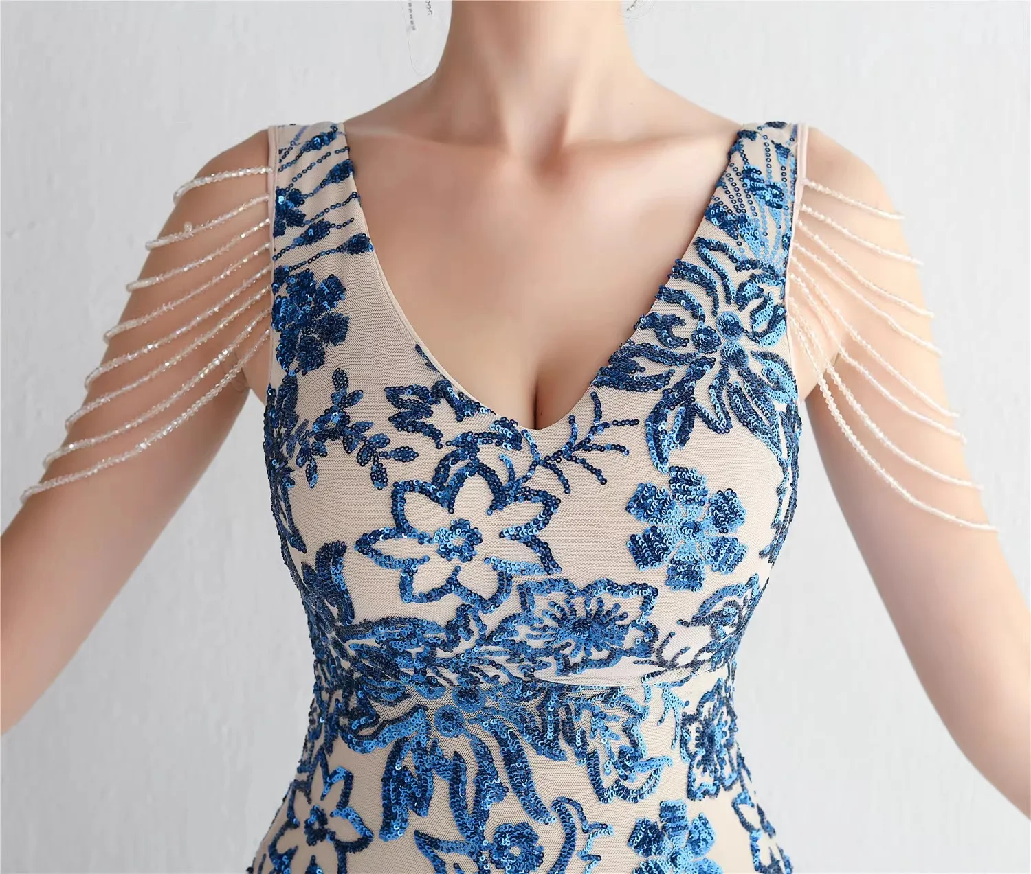 victoria’svogue Sequins Evening Dress For Women 2025 Deep V-neck Satin Prom Party Green Dress Floor Length Blue Formal Gown
