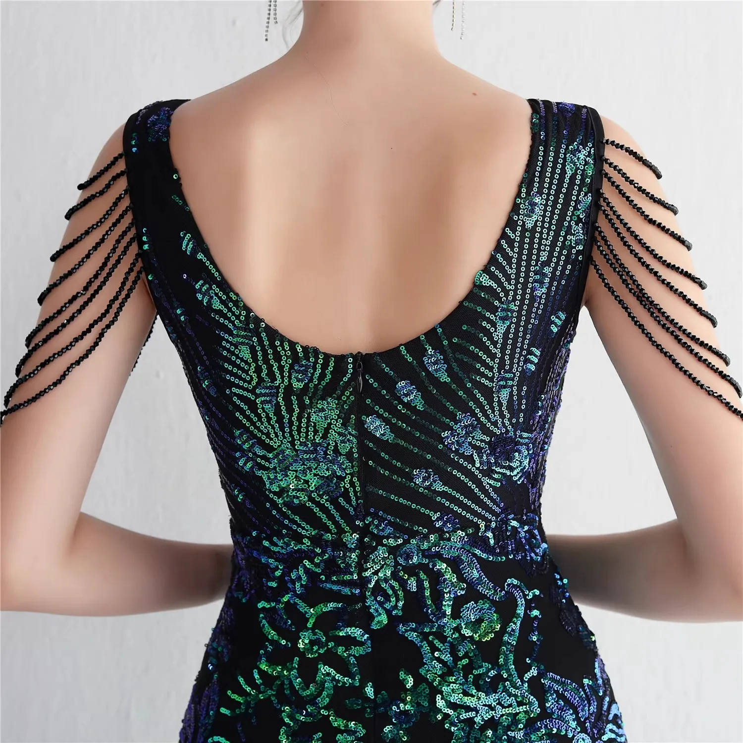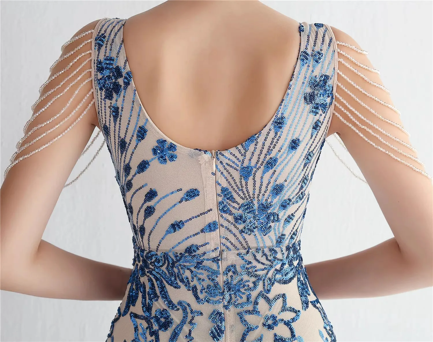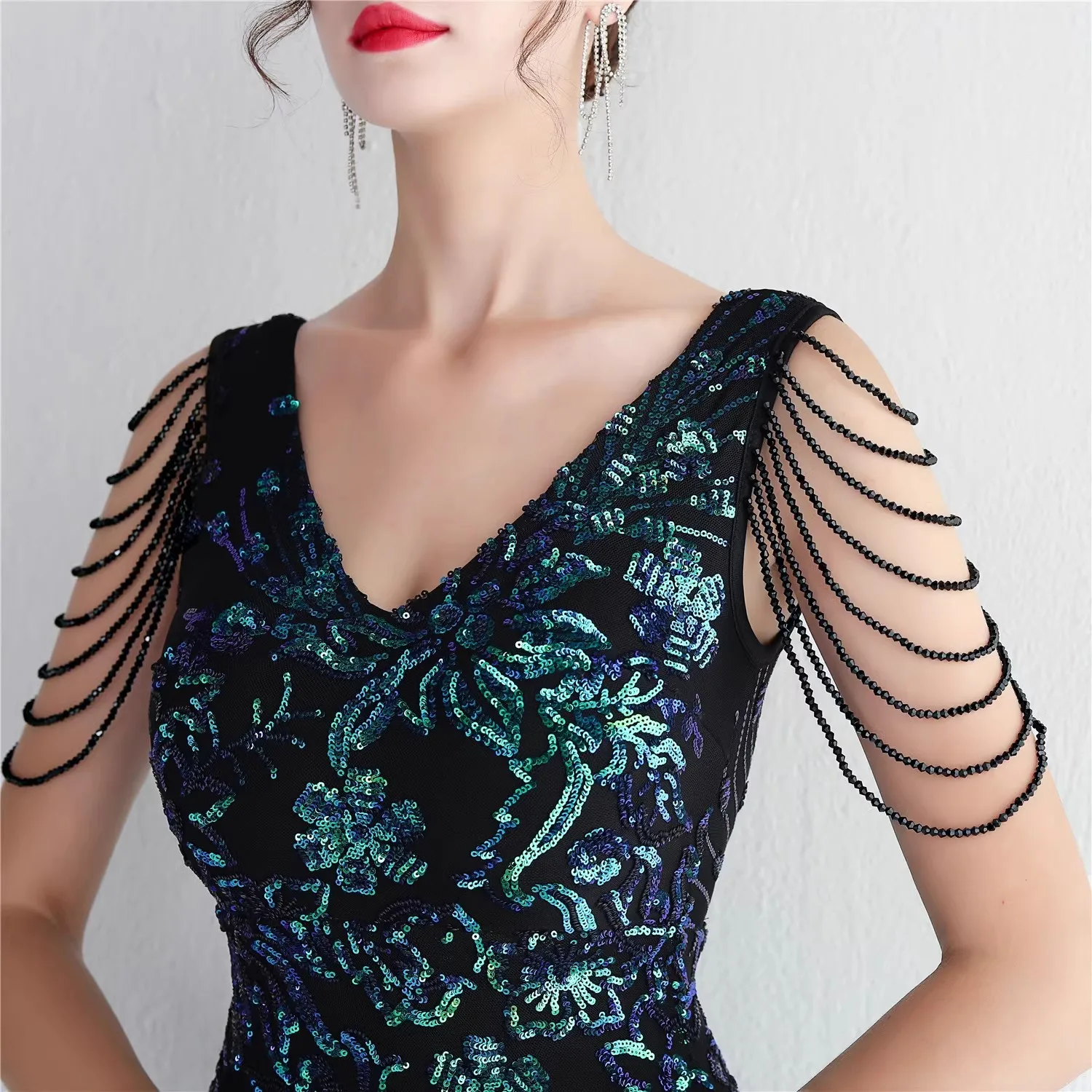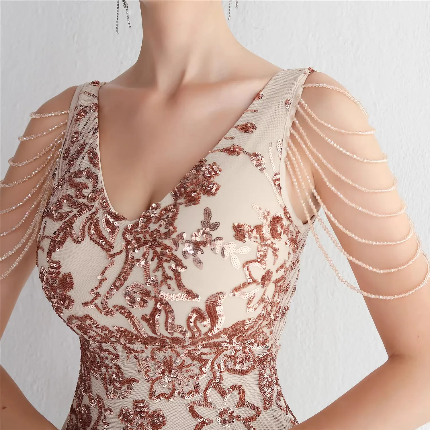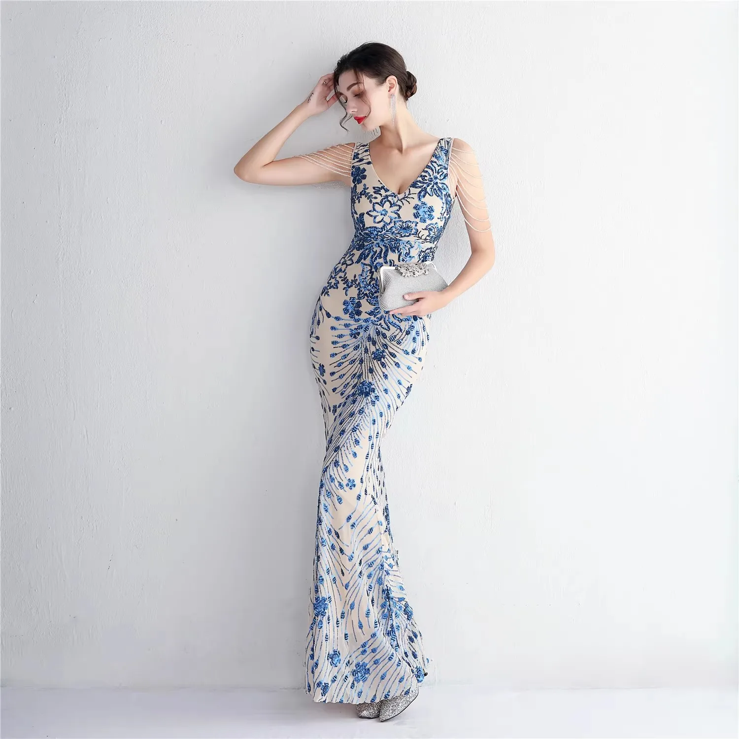 victoria’svogue Sequins Evening Dress For Women 2025 Deep V-neck Satin Prom Party Green Dress Floor Length Blue Formal Gown