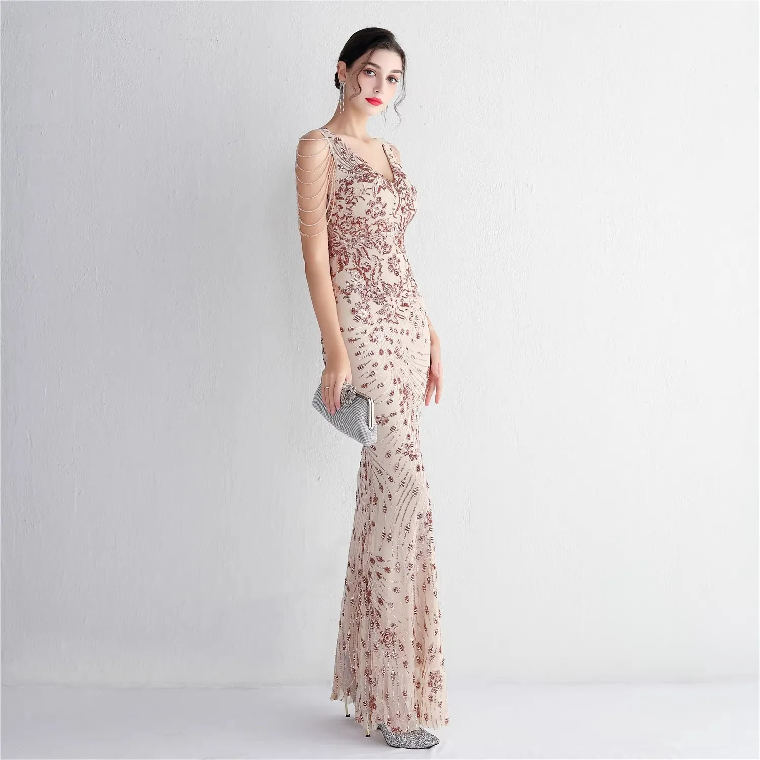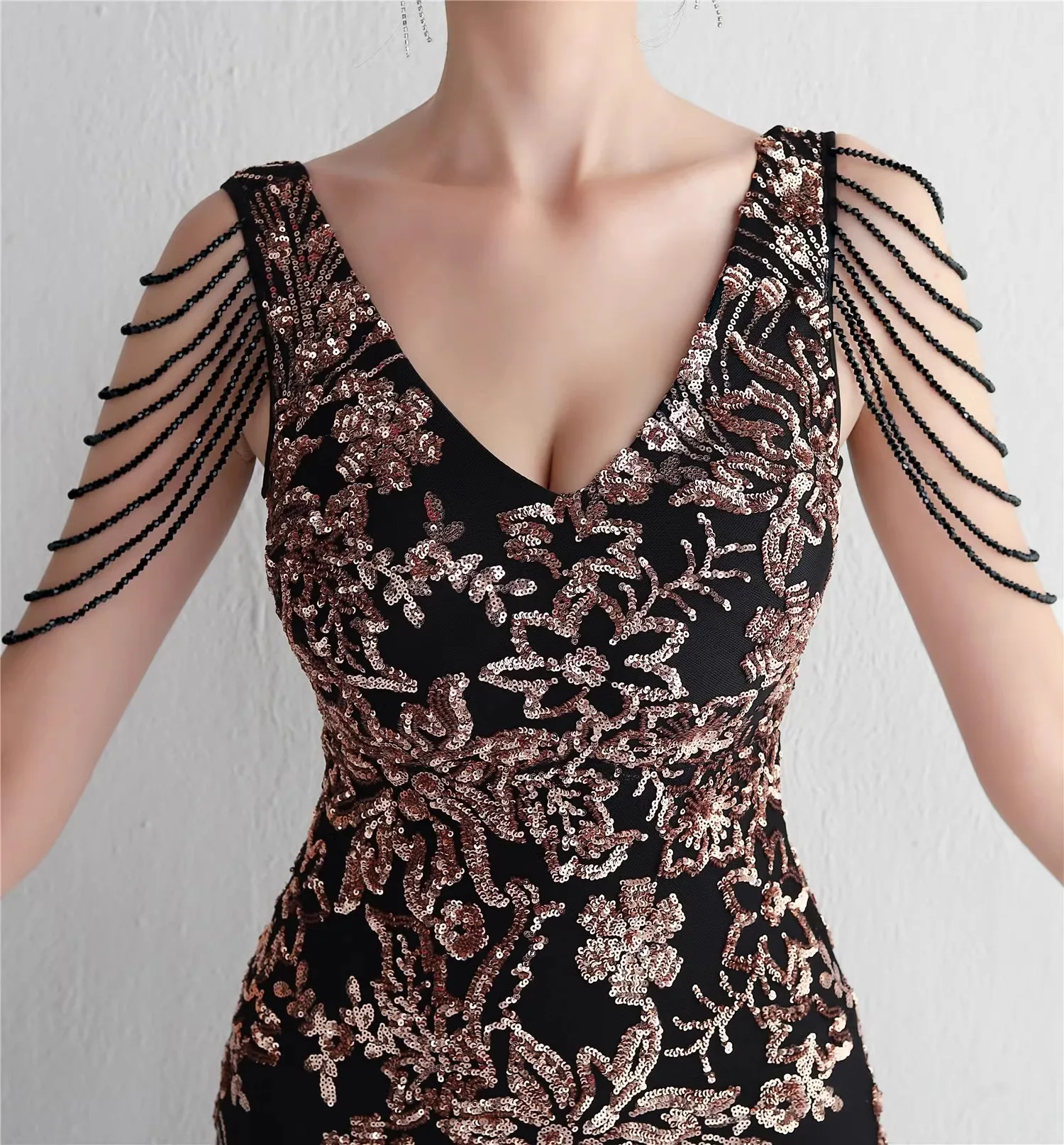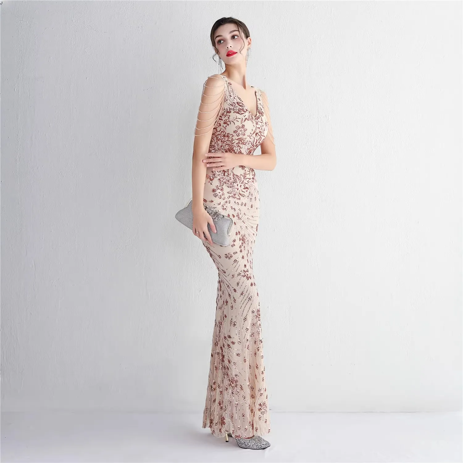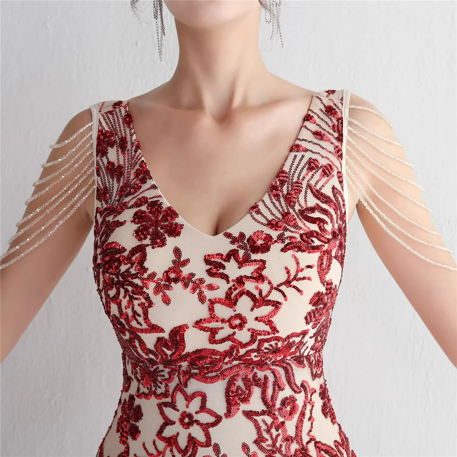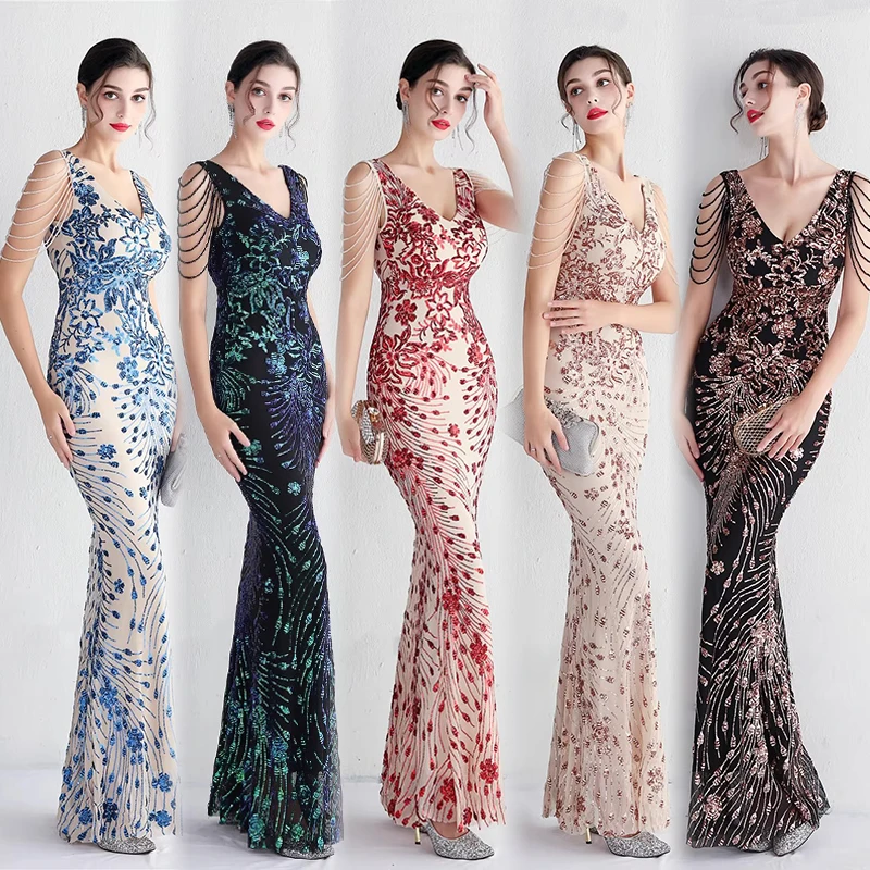 victoria’svogue Sequins Evening Dress For Women 2025 Deep V-neck Satin Prom Party Green Dress Floor Length Blue Formal Gown