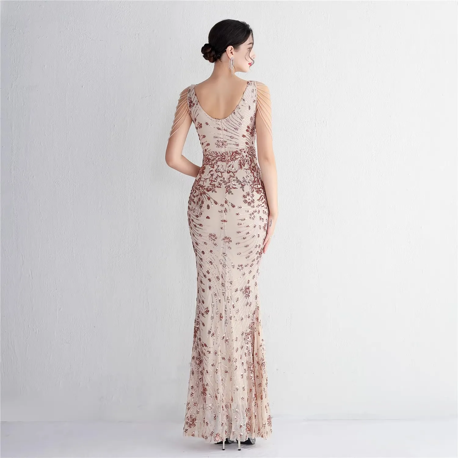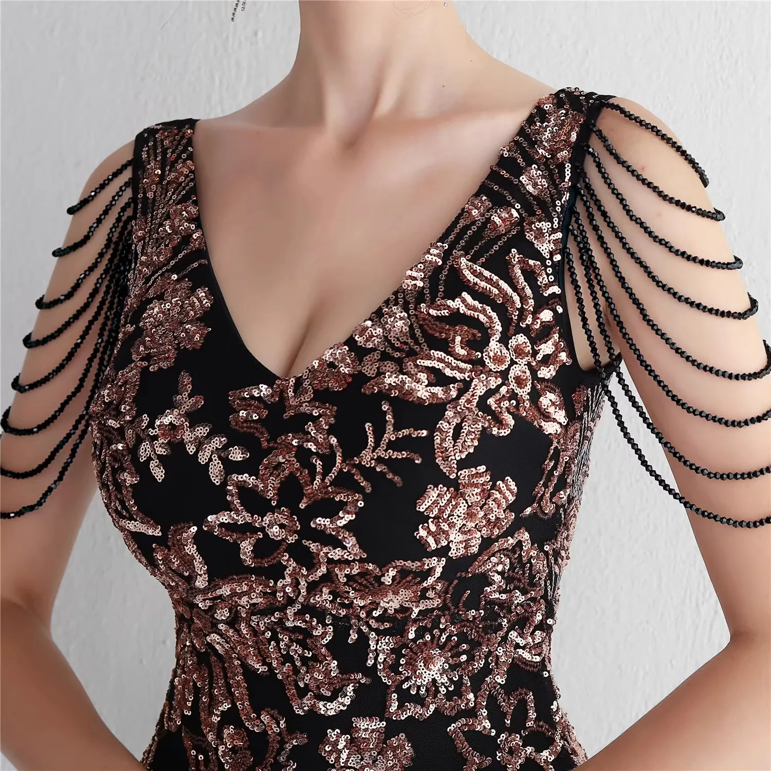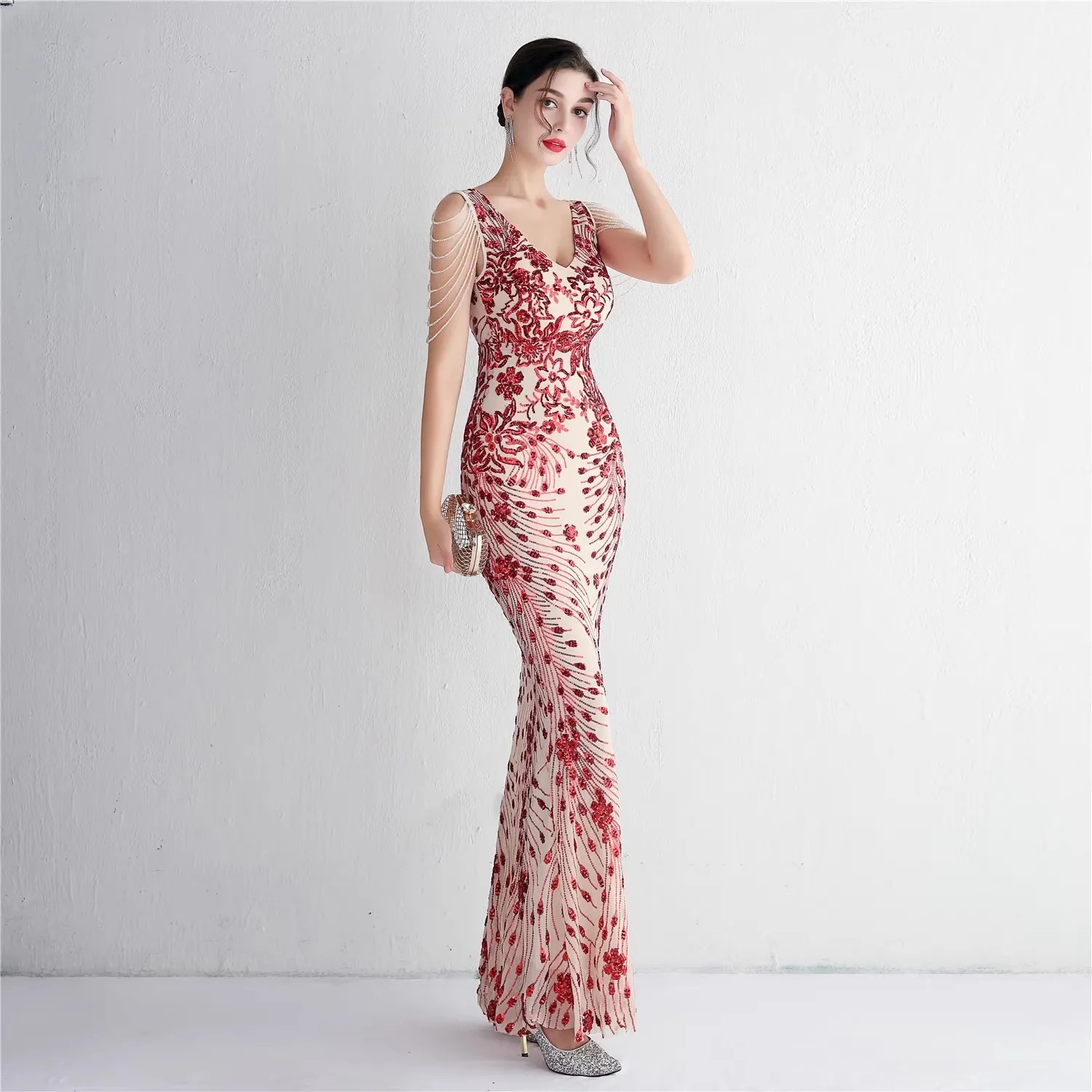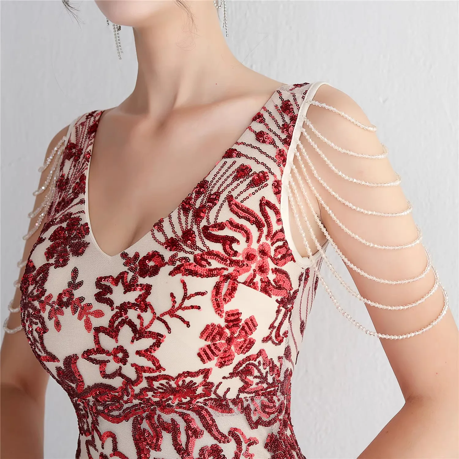 victoria’svogue Sequins Evening Dress For Women 2025 Deep V-neck Satin Prom Party Green Dress Floor Length Blue Formal Gown
