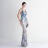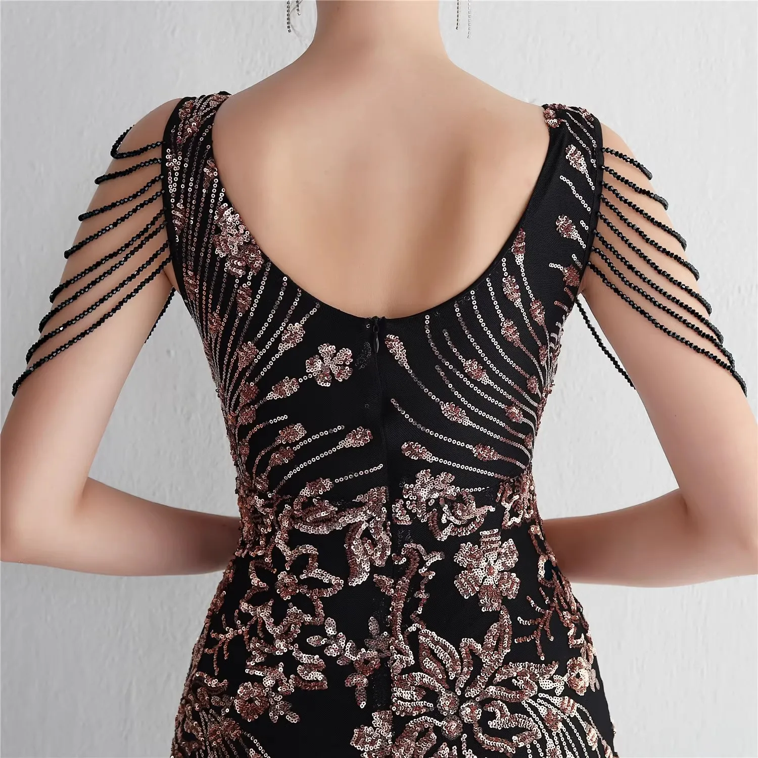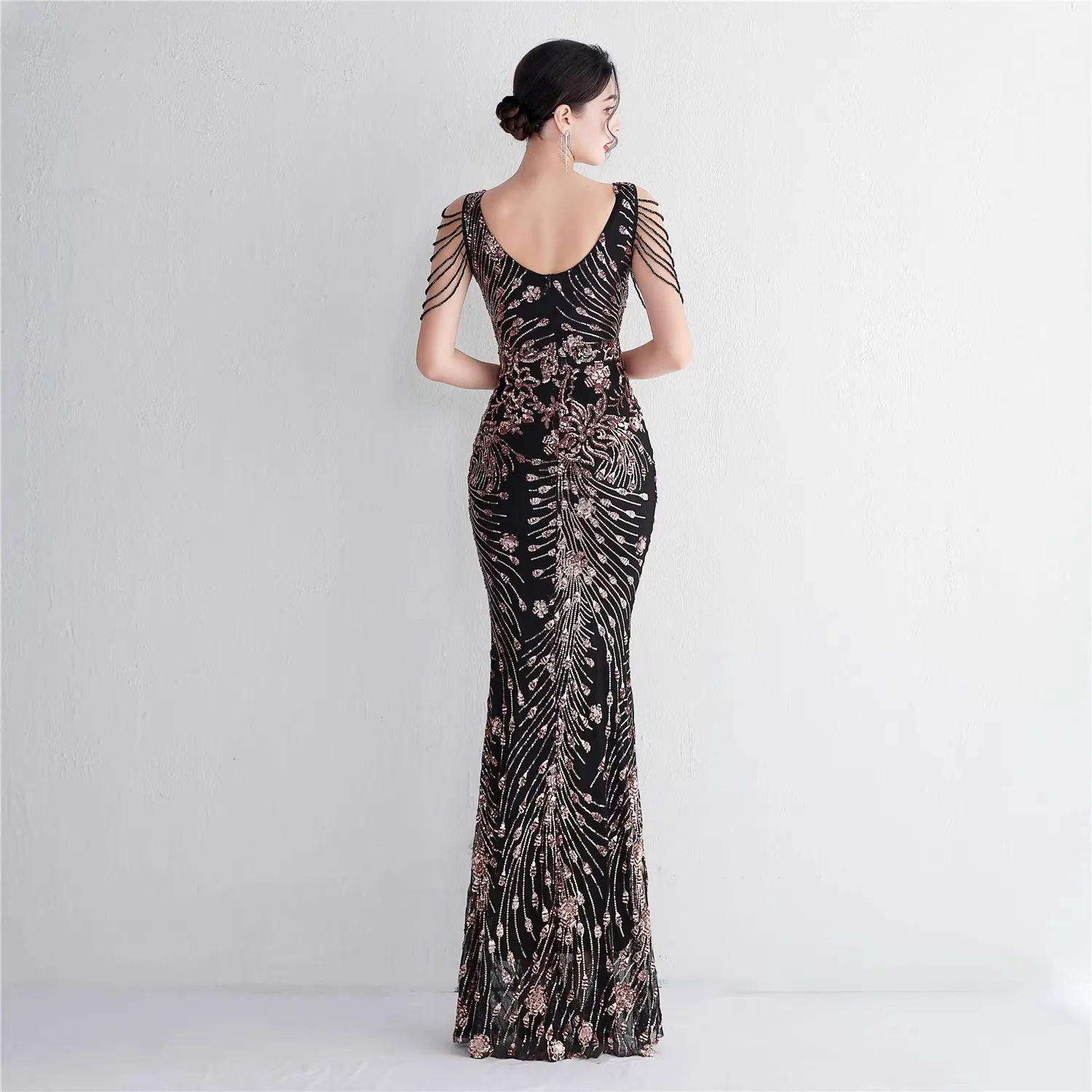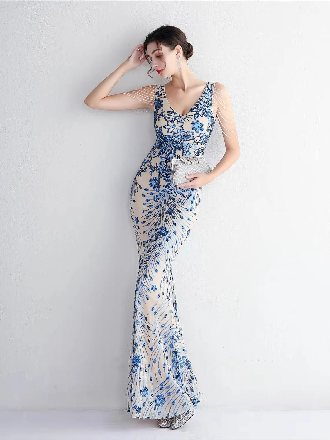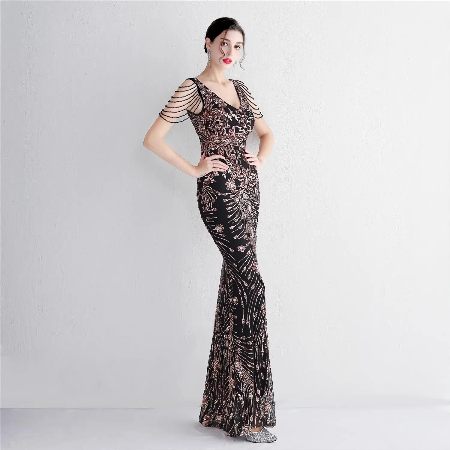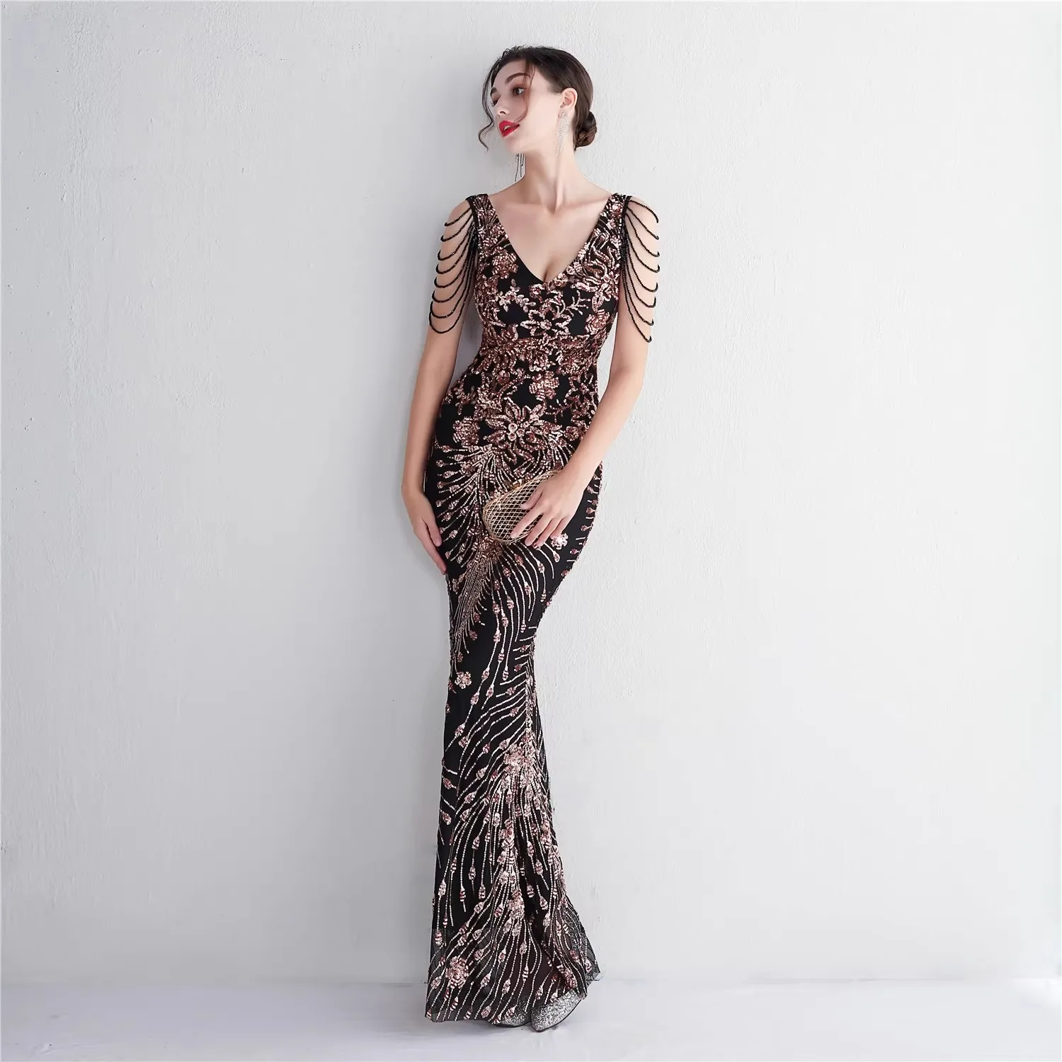 victoria’svogue Sequins Evening Dress For Women 2025 Deep V-neck Satin Prom Party Green Dress Floor Length Blue Formal Gown
