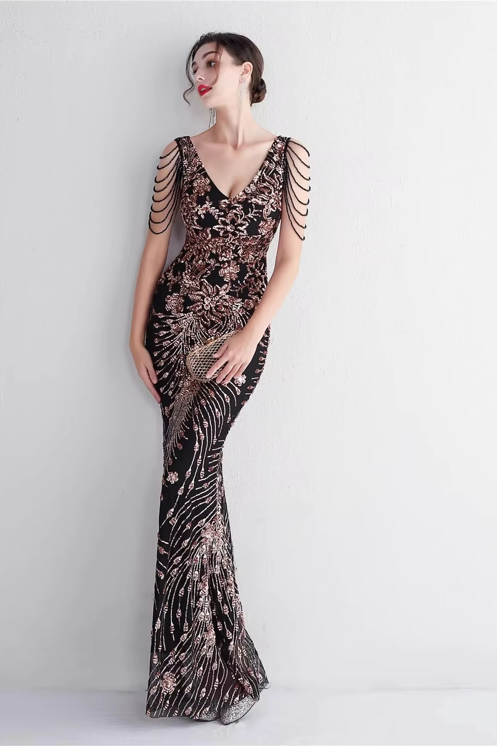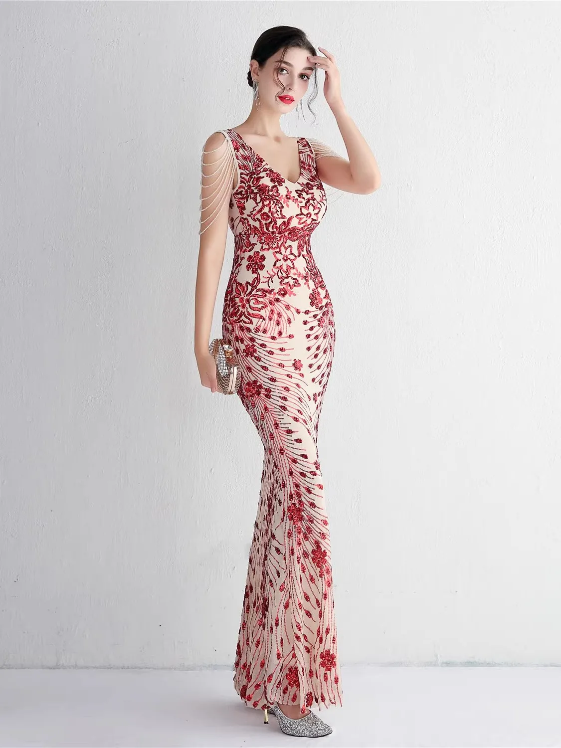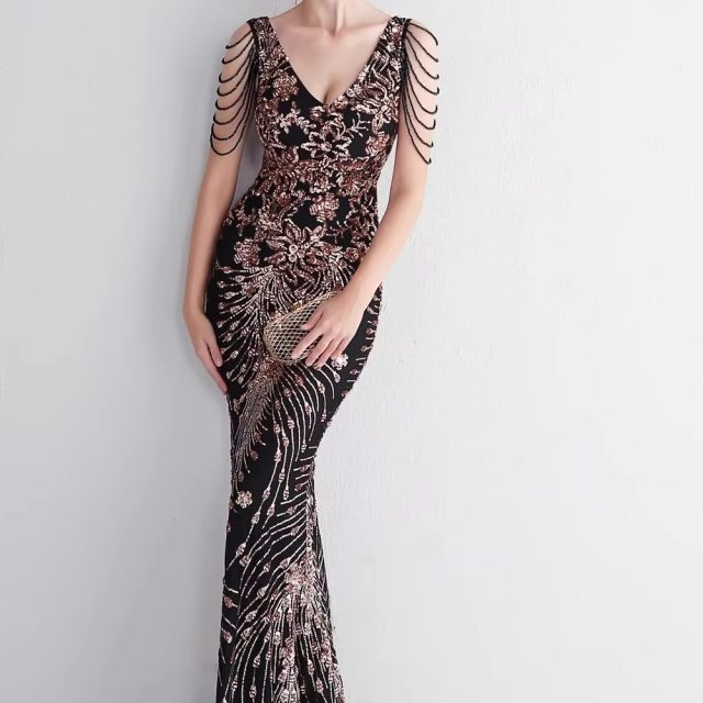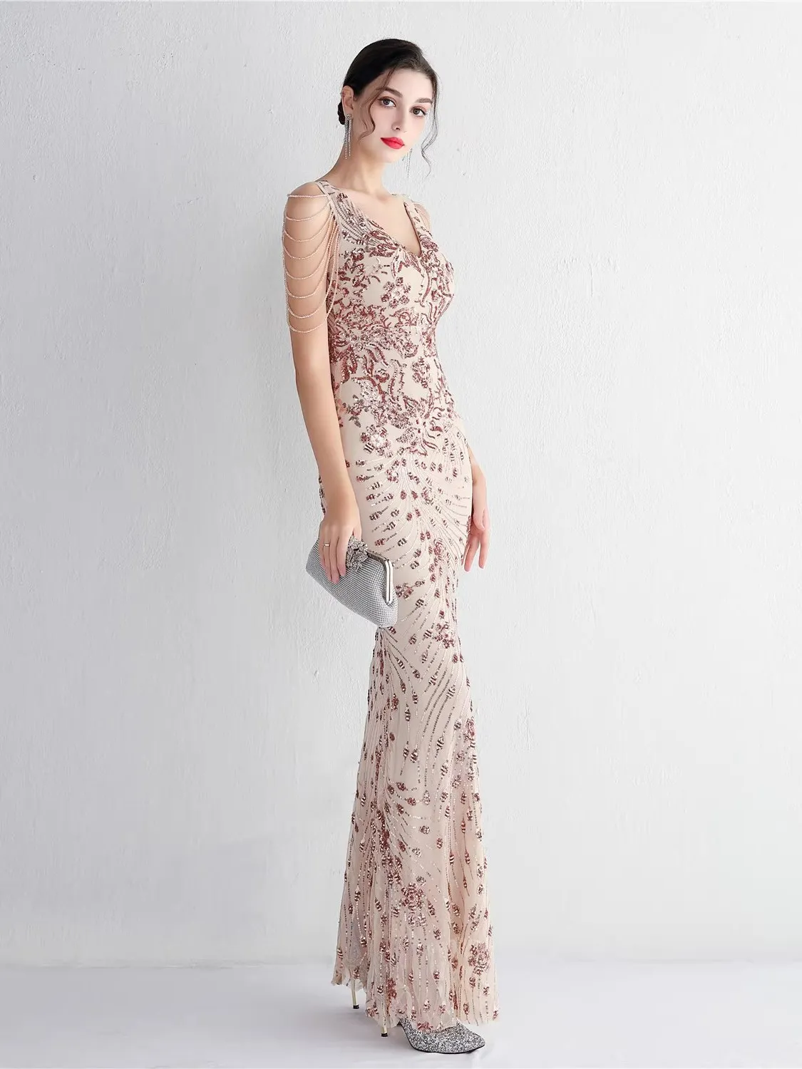 As a long evening gown, it is ideal for weddings, formal events, or any special occasion requiring a dress of this caliber.