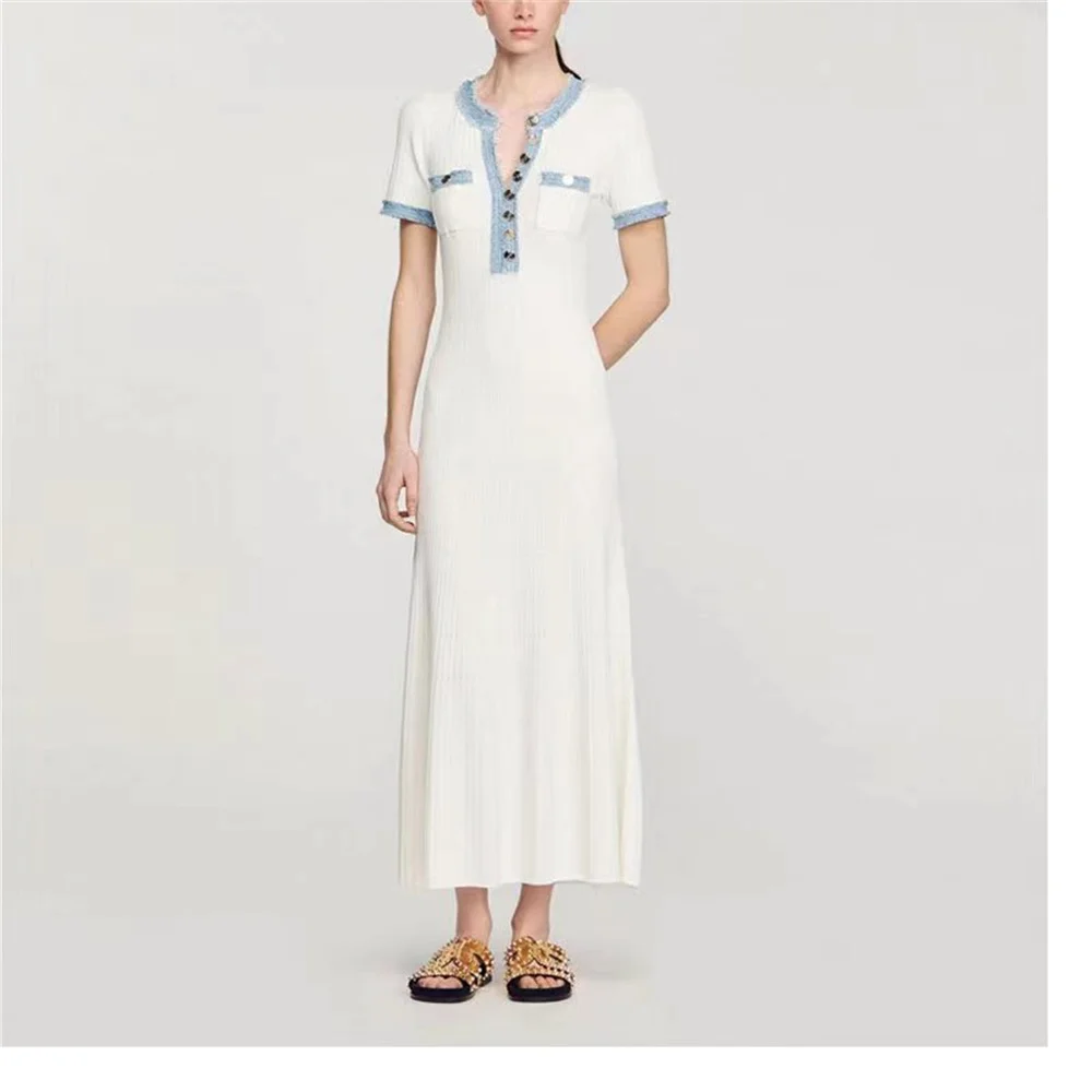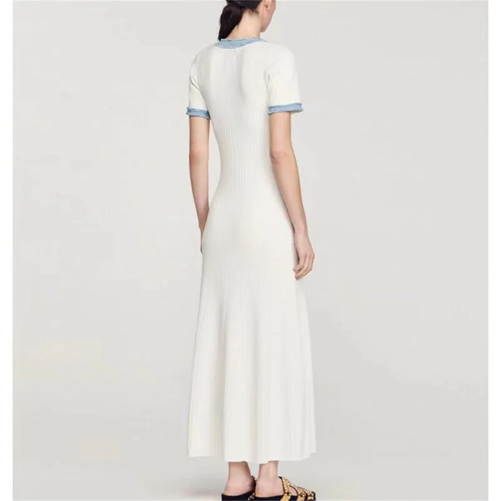 Victoria’s Vogue Elegant Contrasting Women Knit Maxi Dress Chic O-neck Short Sleeve Metal Buttons Bodycon Dresses Office Lady Commuting Robe