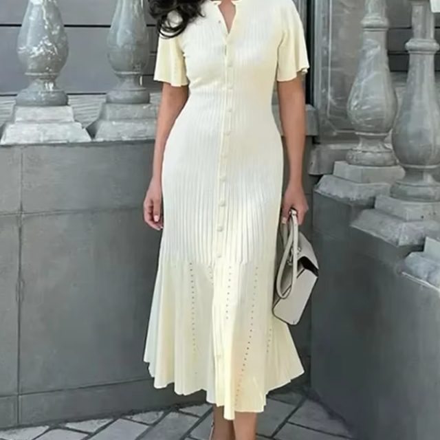 victoria’svogue Elegant Knitted Dress Women Solid Single Breasted O Neck Short Sleeve High Waist Hip Package Dresses 2025 Autumn Chic Robes Lady