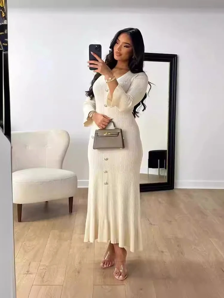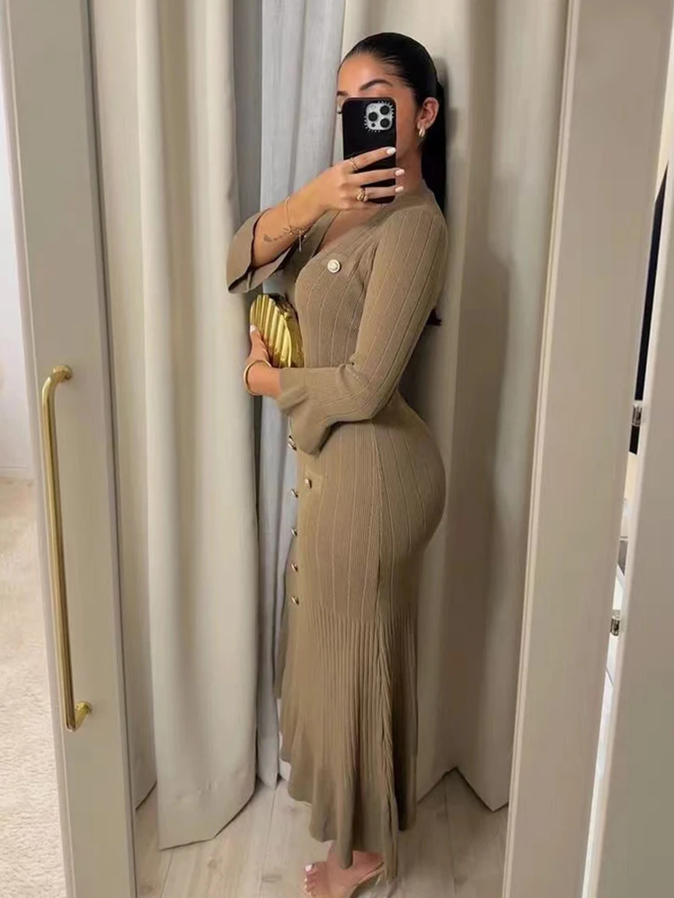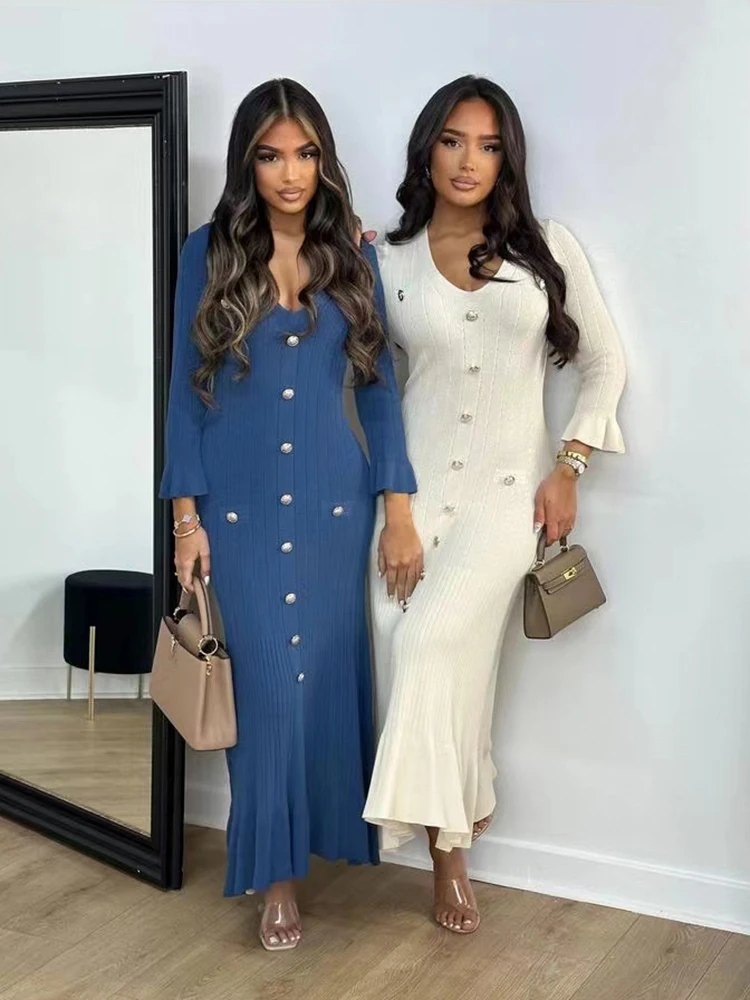 Victoria’s Vogue Elegant Knitted Long Dress Women Flare Sleelve V Neck Ruffles Single Breasted Bodycon Dresses Party Fashion Office Lady Vestidos