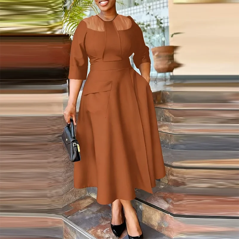 Victoria’s Vogue Elegant O-Neck Pocket Long Dresses Sexy Perspective Mesh Solid Color Party Dress Women’s Fashion Autumn Half Sleeve Ball Dress
