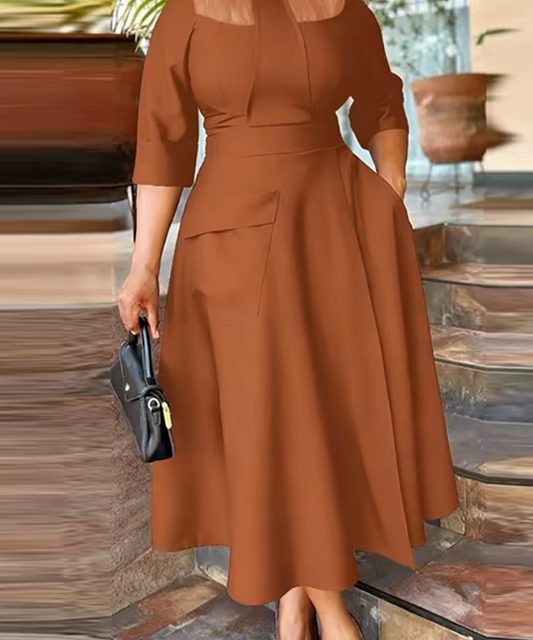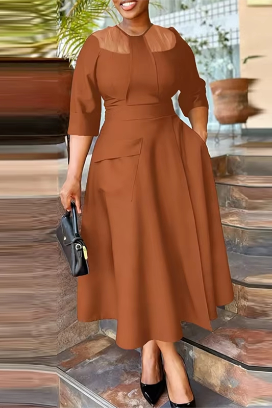 Victoria’s Vogue Elegant O-Neck Pocket Long Dresses Sexy Perspective Mesh Solid Color Party Dress Women’s Fashion Autumn Half Sleeve Ball Dress