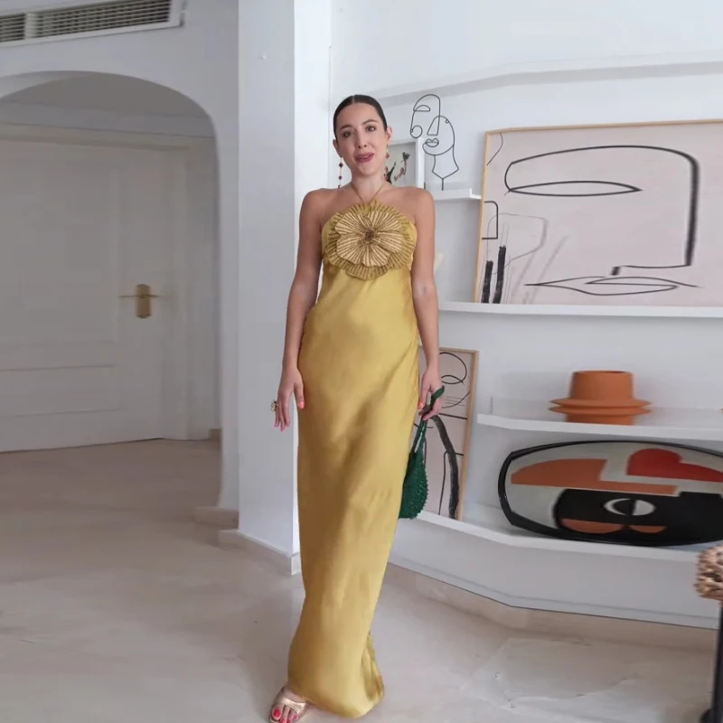 Victoria’s Vogue Elegant Party Women’s Dress 3D Flower Halter Sleeveless Backless Mermaid Satin Female Dresses 2025 Summer Chic Evening Lady Robe