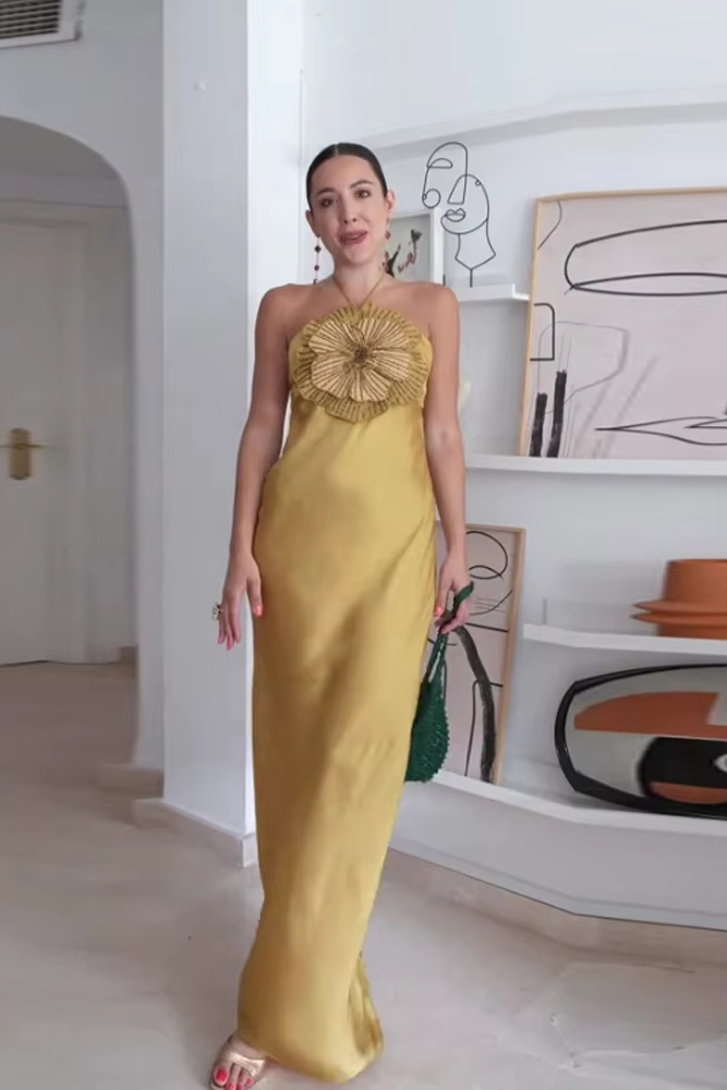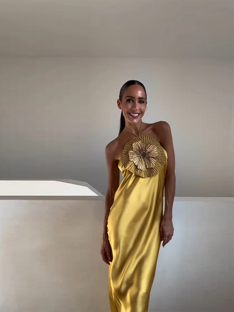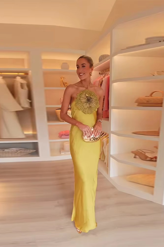 Victoria’s Vogue Elegant Party Women’s Dress 3D Flower Halter Sleeveless Backless Mermaid Satin Female Dresses 2025 Summer Chic Evening Lady Robe