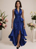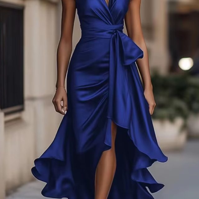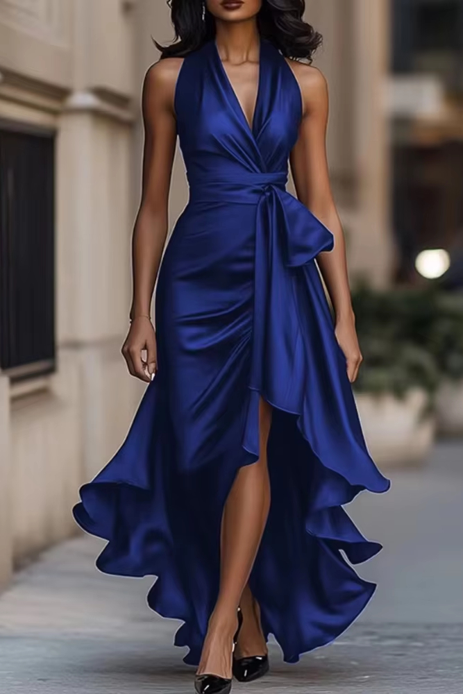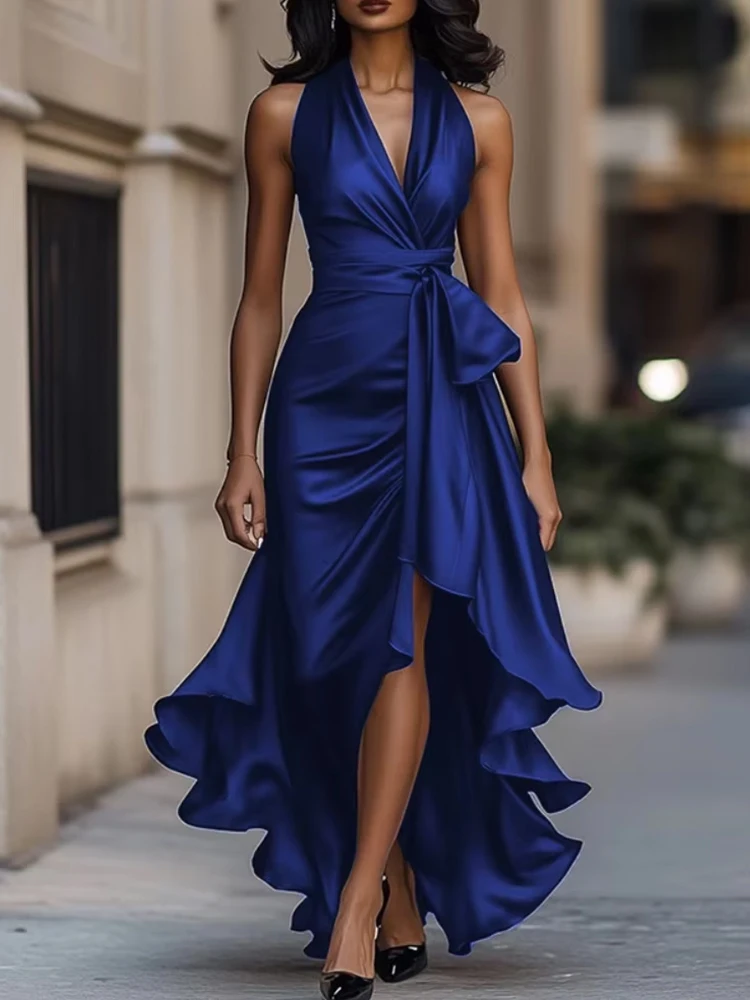 Victoria’s Vogue Elegant Satin Halter V-Neck Dress for Women’s Ruffle Irregular Hem Lace-up Sexy Sleeveless Party Evening Wedding Guest Dress