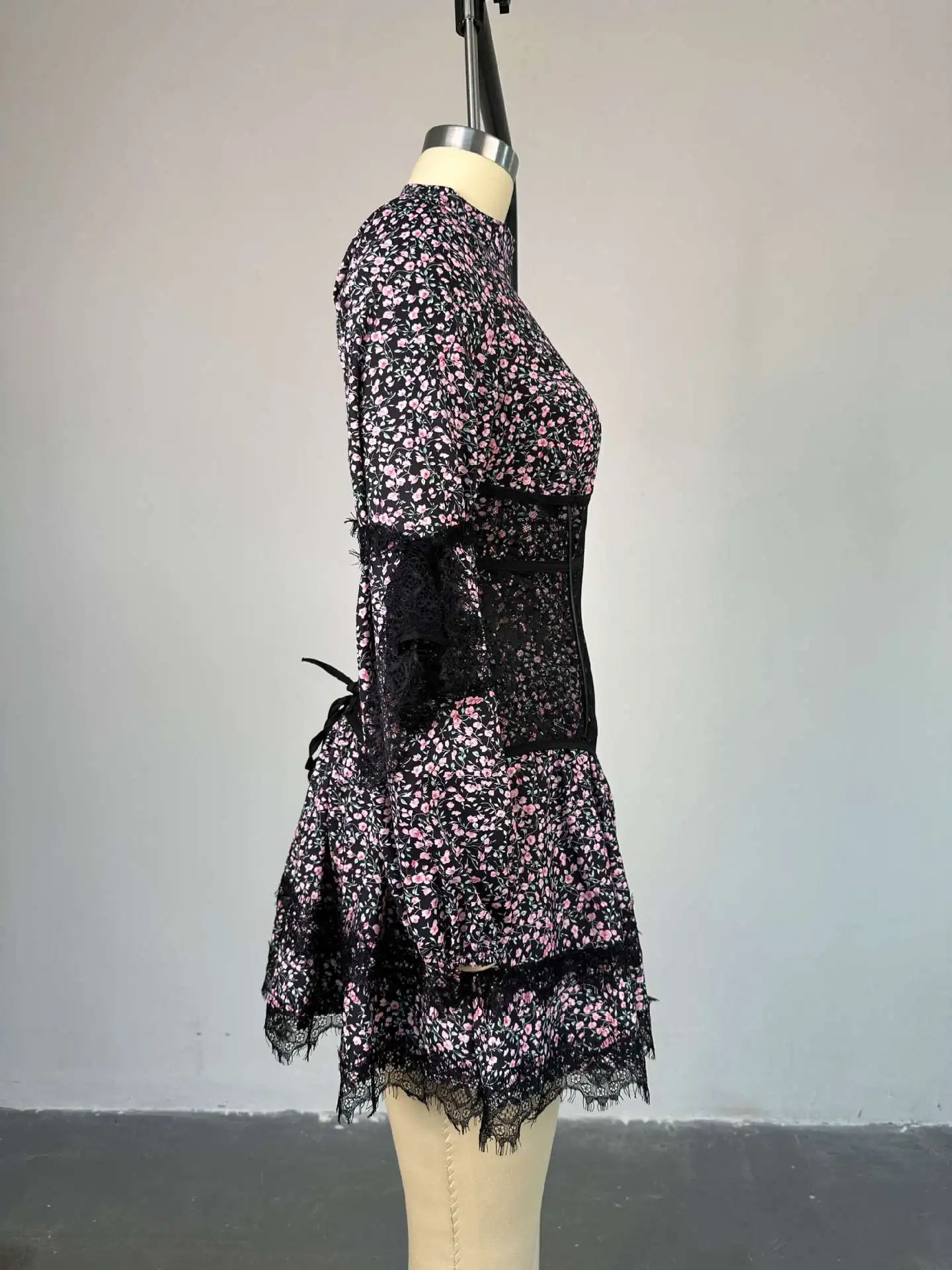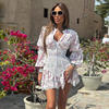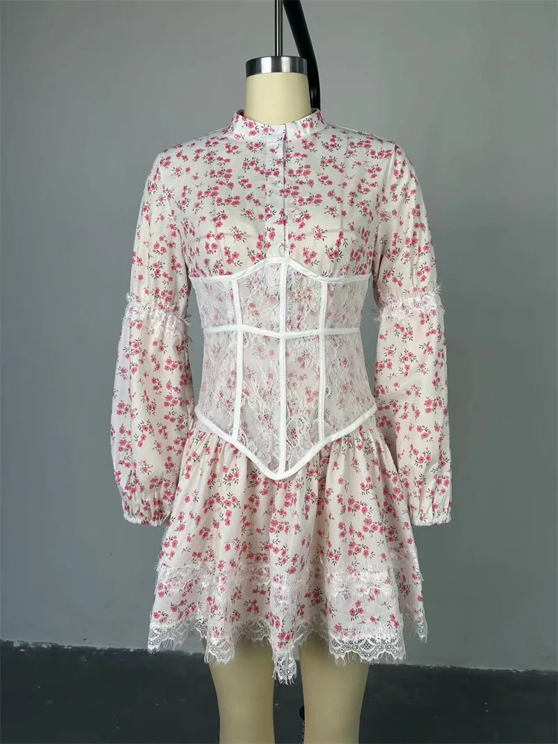 Victoria’s Vogue Elegant Style V-Neck Luxury Printed Lace Mini Dresses Female Ruffled Fashion High Waist Slim Bandage Summer Short Party Dress
