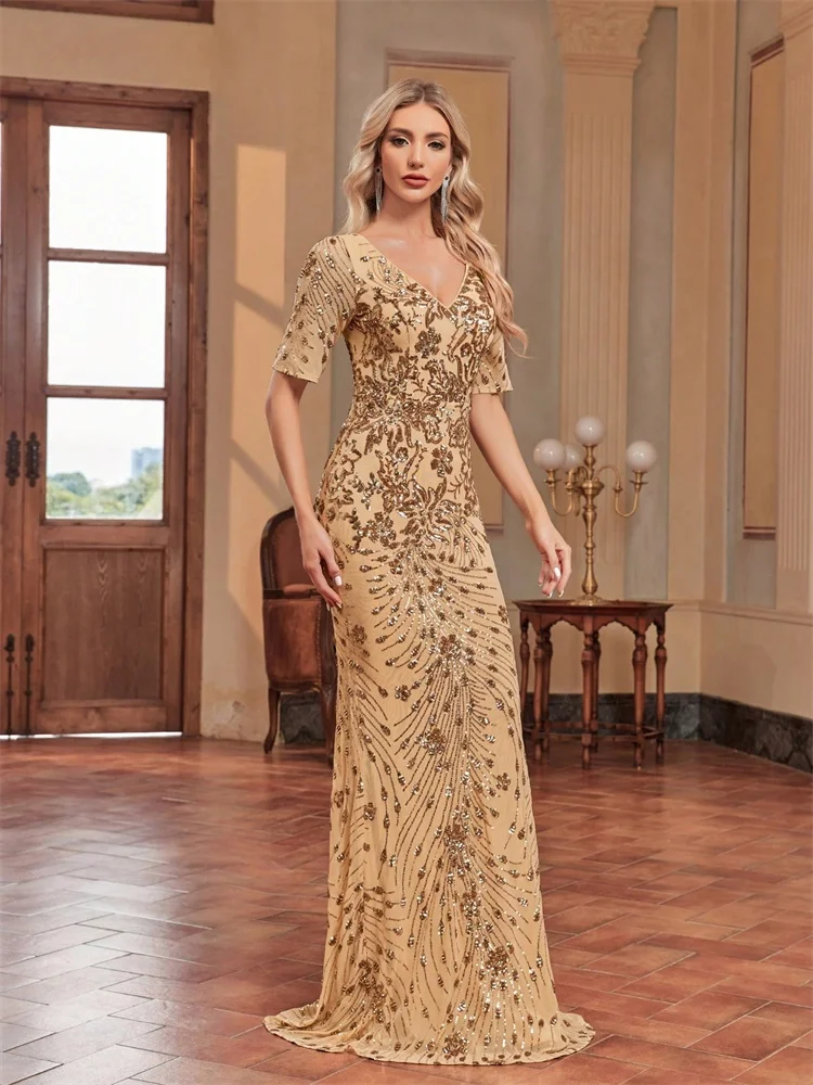 Victoria’s Vogue Elegant V-neck Sequins Evening Dress For Women Short sleeves Mermaid Formal Luxury Party Mermaid Prom Dress