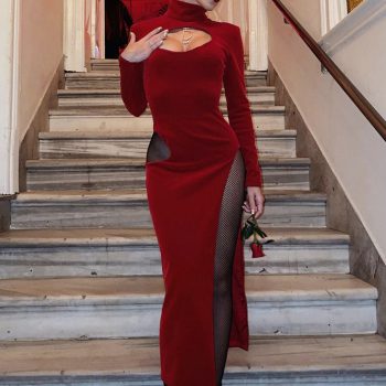 victoria’s vogue Party Dress Women Velvet Hollow Out Turtleneck Sexy Side Split Elegant Women Red Midi Dresses For Woman