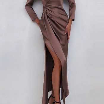 victoria’s vogue Round Collar Bandage Satin Dresses Sexy Long Sleeve High Waist Elegant Vestidos Side Slit Ankle Length Patchwork Dress