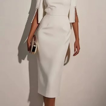 victoria’svogue Women’s Solid Color Elegant Round Neck Half Sleeve Beaded Decorated Slim Fit Midi Dress