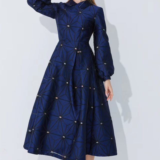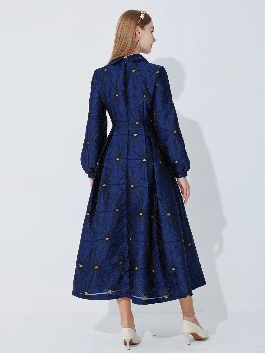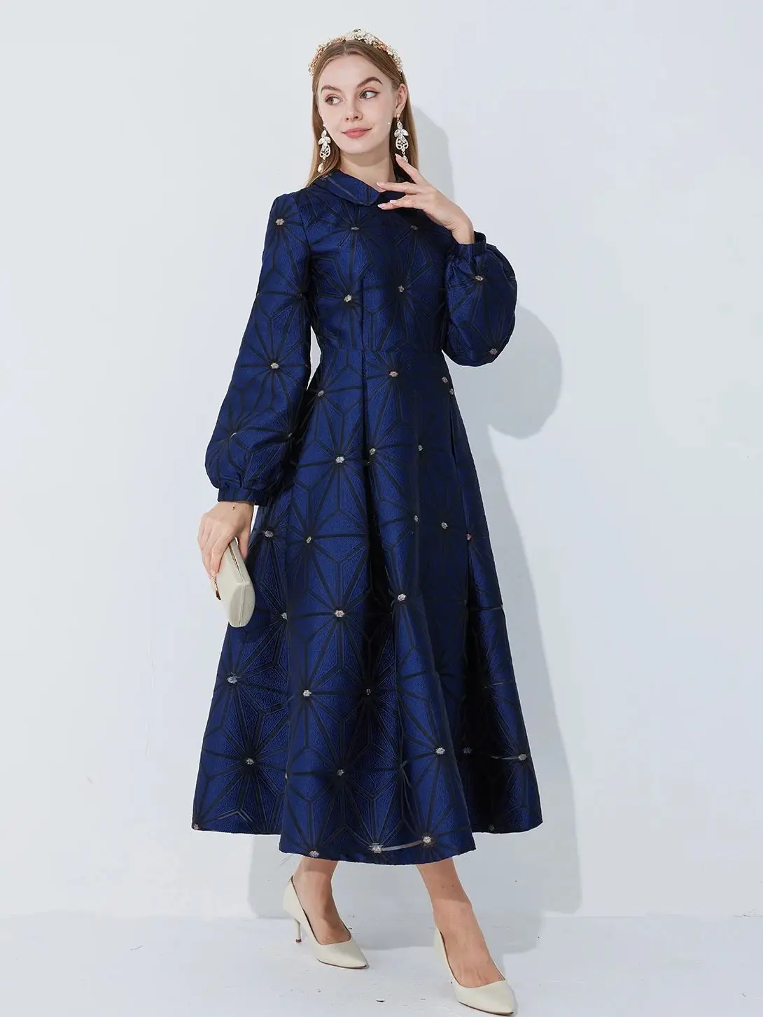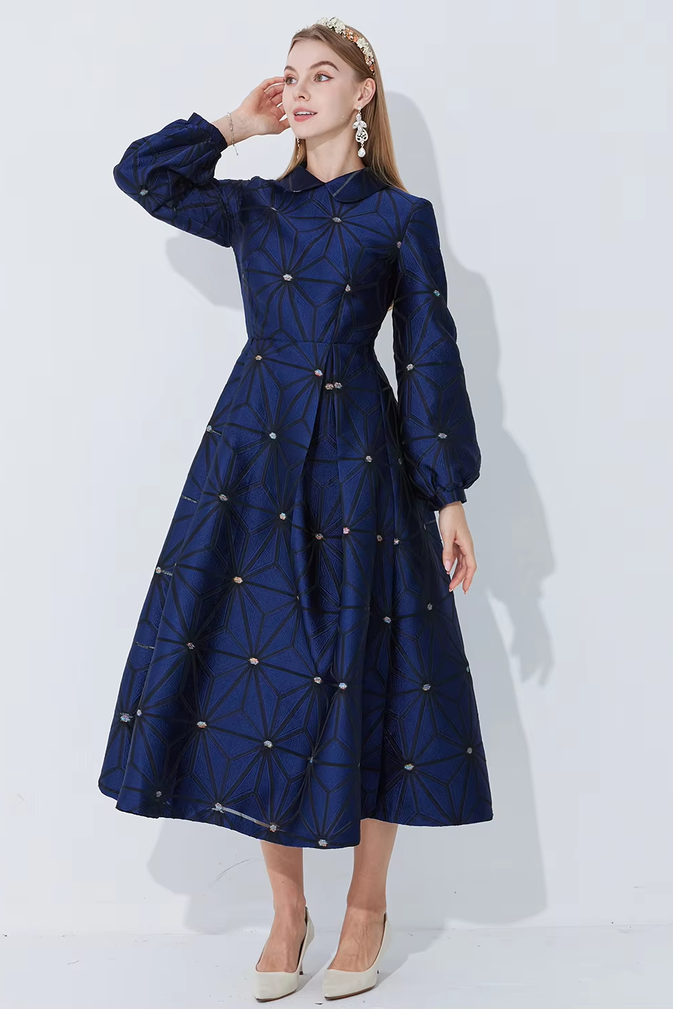 Victoria’s Vogue Turned Collar Lined Sleeve A-Line Silhouette Geometric Heavyweight Jacquard Elegant and Graceful Long Dress