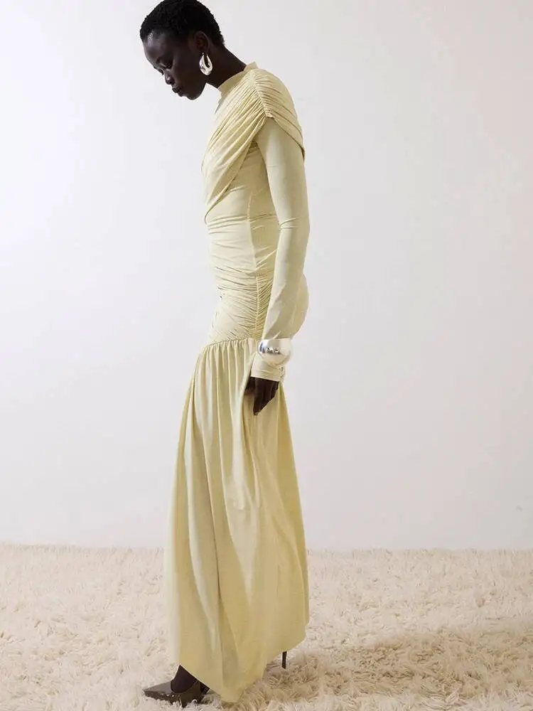 Victoria’s Vogue Irregular Long Sleeve Bandage Ruched Women Mini Dress Round Neck High Waist Dress Autumn New Elegant Party Evening Dress