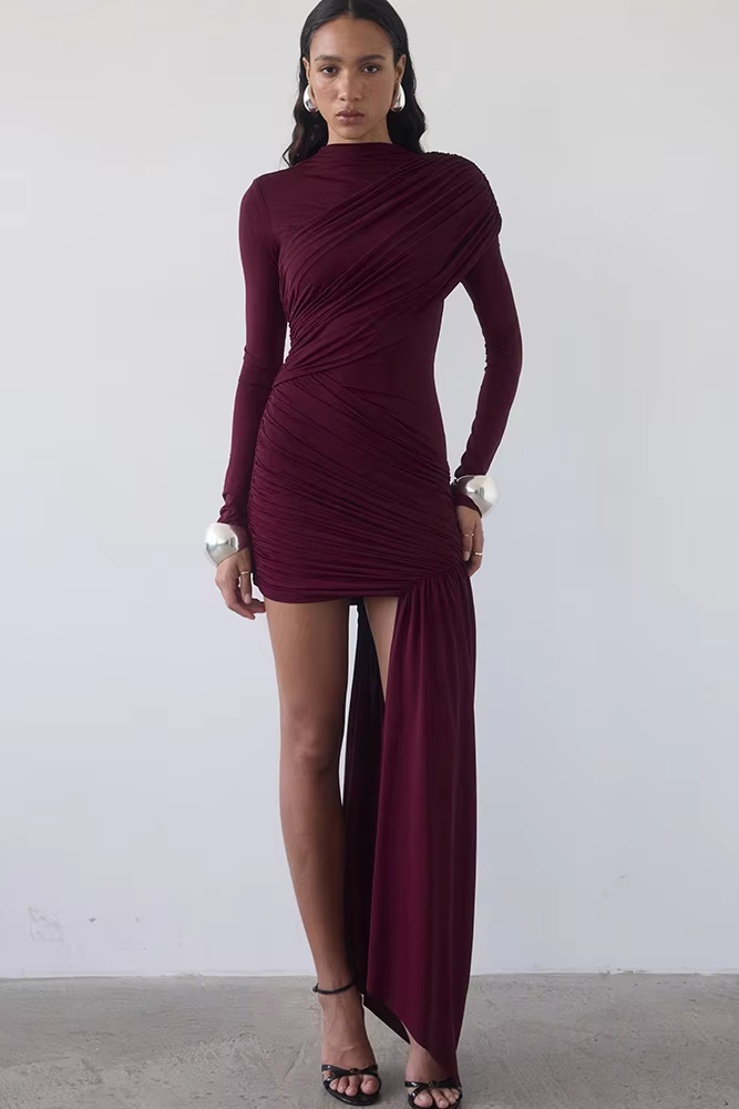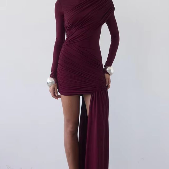 Victoria’s Vogue Irregular Long Sleeve Bandage Ruched Women Mini Dress Round Neck High Waist Dress Autumn New Elegant Party Evening Dress