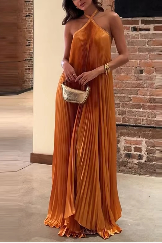 Victoria’s Vogue Fashion Pleated Solid Color Long Dress Sexy Halter Hollow Out Loose Evening Dress Women Elegant Sleeveless Backless Party Dress