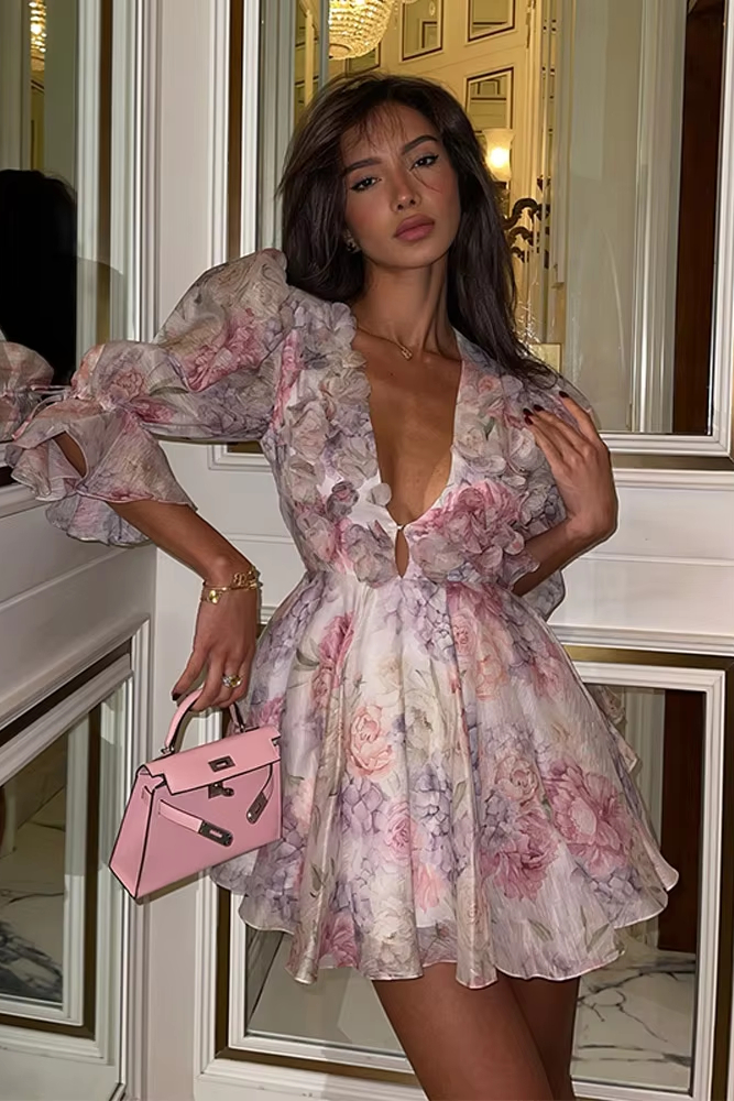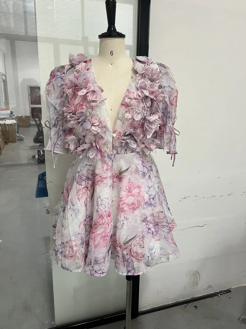 Victoria’s Vogue Flower Printed Short Puff Sleeve Mini Dress Women V Neck Beach Holiday Summer Short Vestido 2025 Beach A-line Sexy Casual Gown