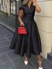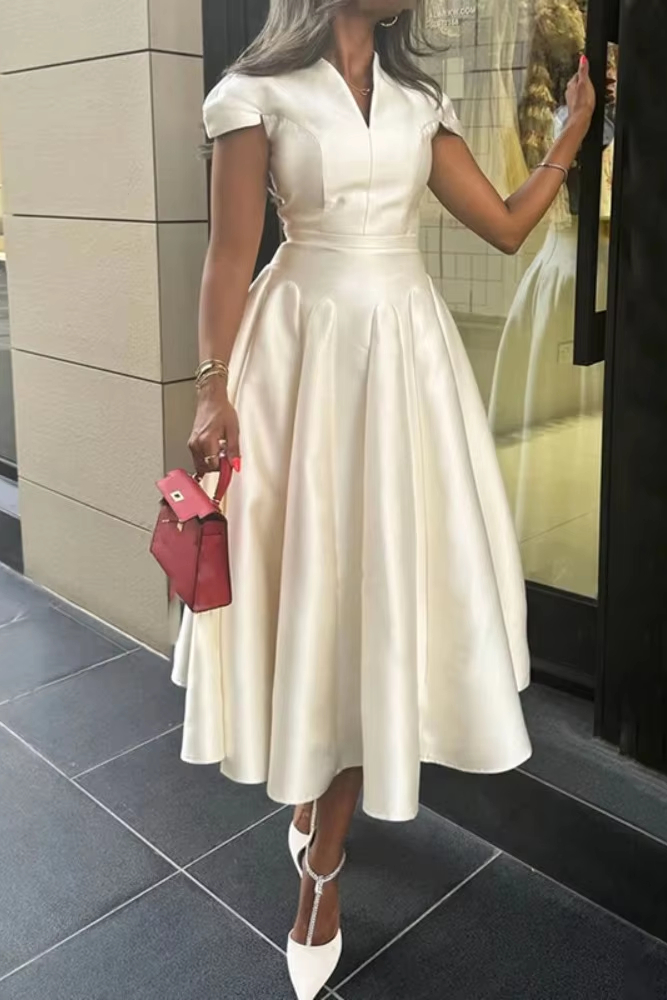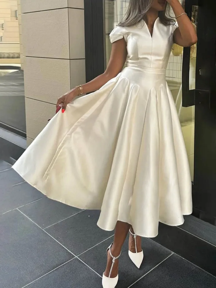 Victoria’s Vogue Women’s Elegant Dress V-neck Cap Sleeves Slim Fit A-line Party Dresses Solid Color High Waist Pleated Midi Dress