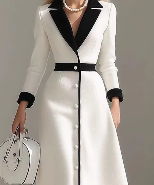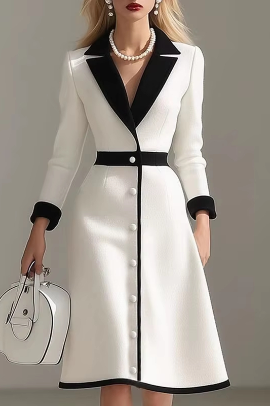 Victoria’s Vogue French Color Block Notched Collar Blazer Dresses Woman Button Decoration A-Line Office Dress Fall 3/4 Sleeve Elegant Party Dress