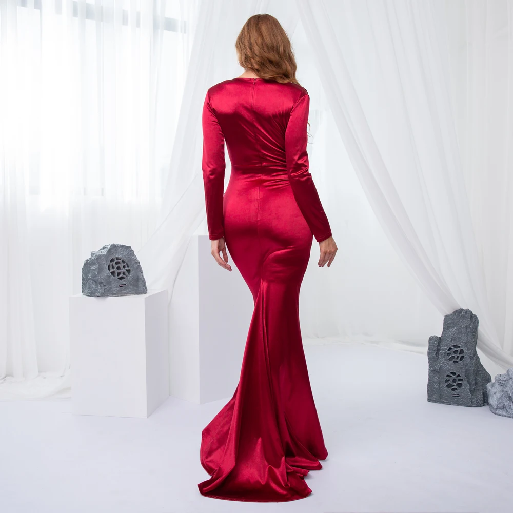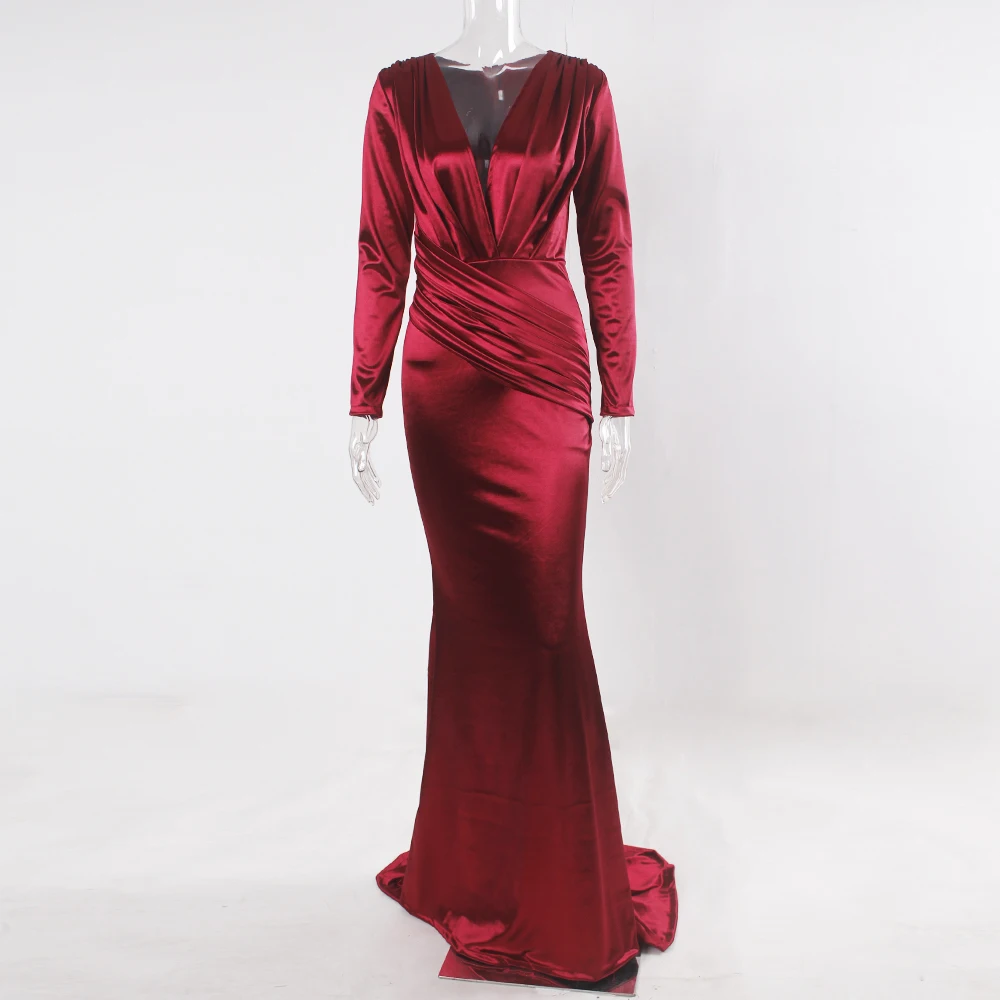 victoria’svogue 2021 Full Sleeved V Neck Pleated Maxi Dress Burgundy Elegant Floor Length Evening Party Gown