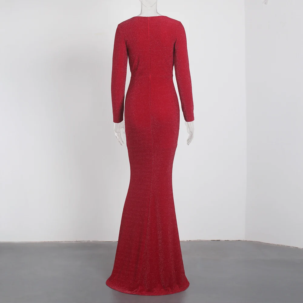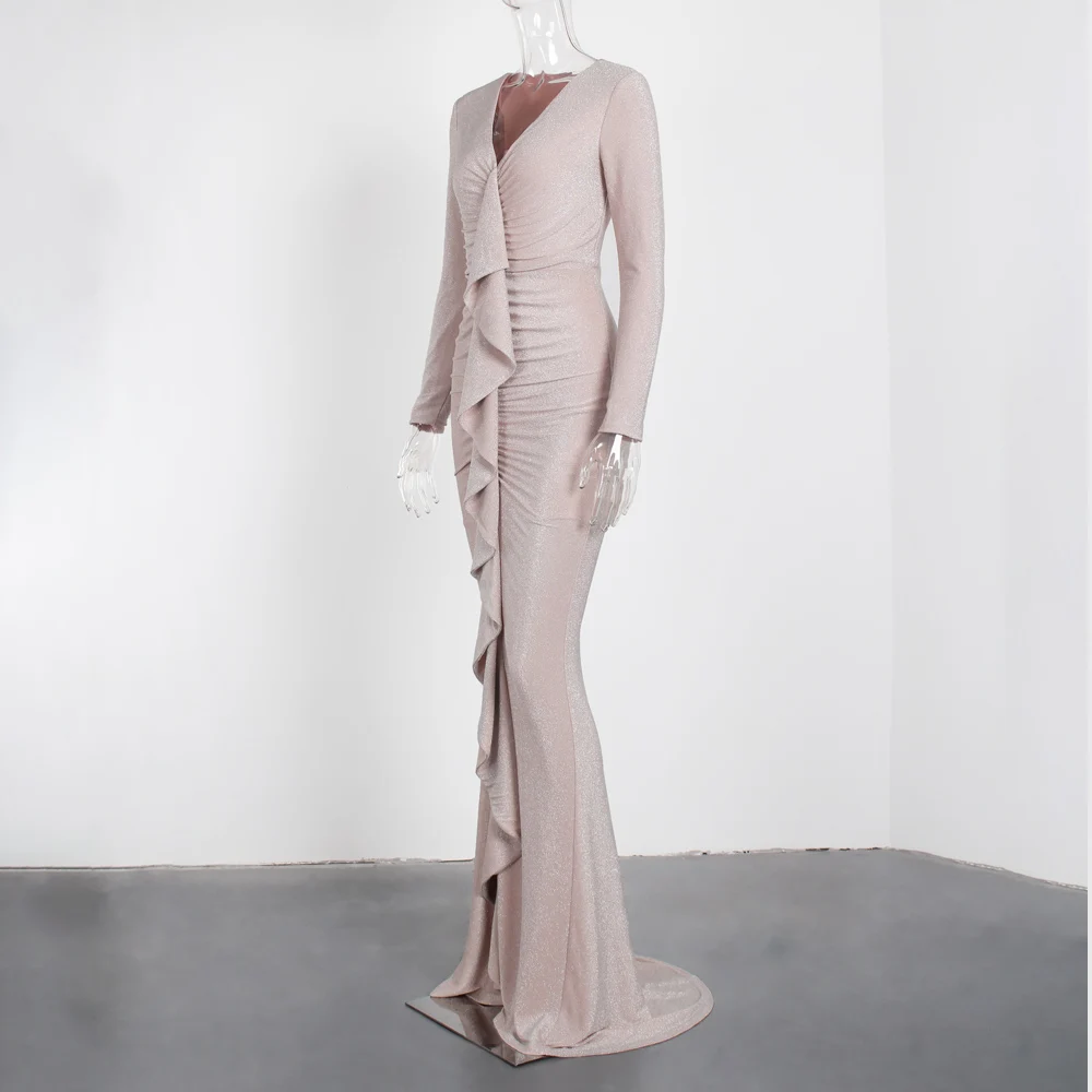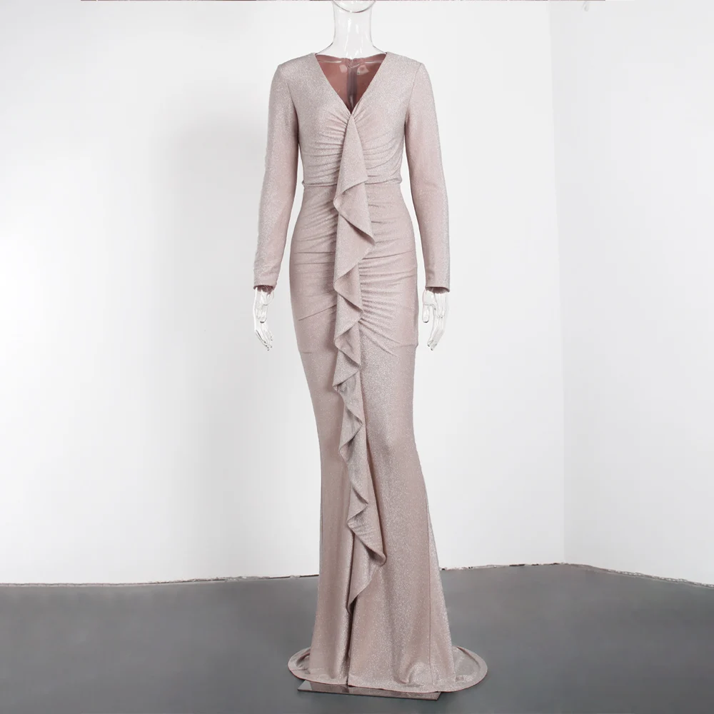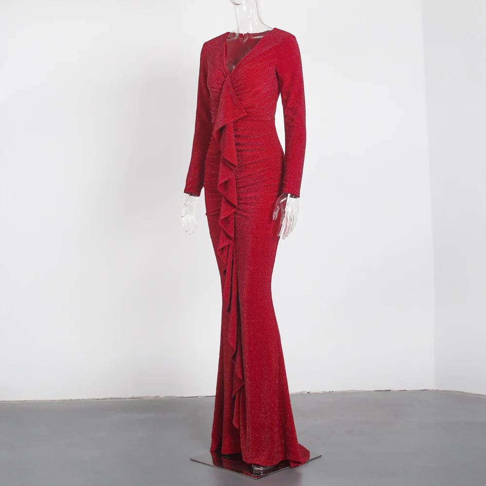 victoria’svogue 2021 Full Sleeved V Neck Stretchy Evening Party Maxi Dress Drap Ruffled Bodycon Formal Long Gown
