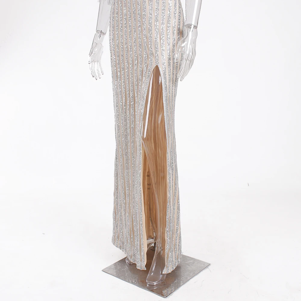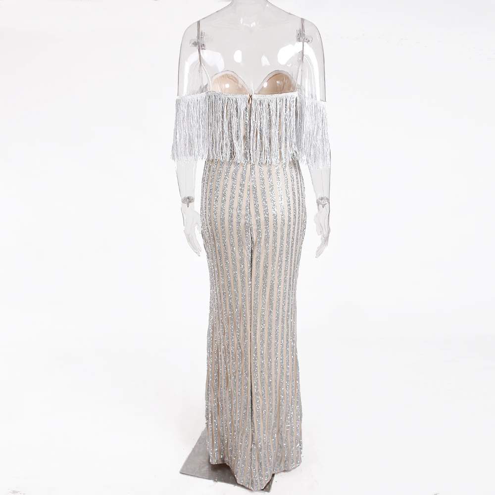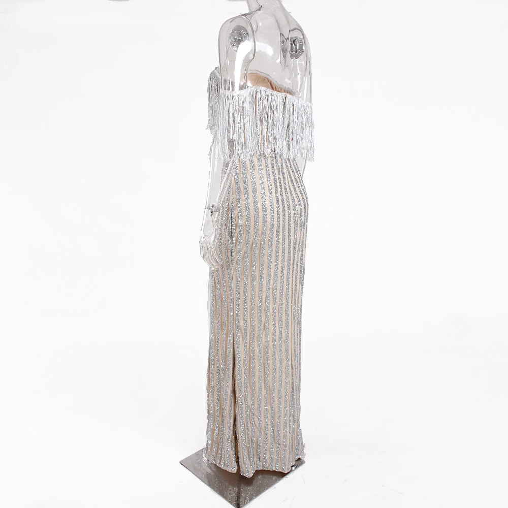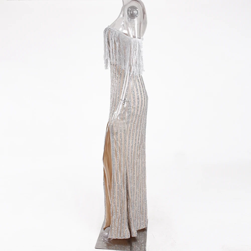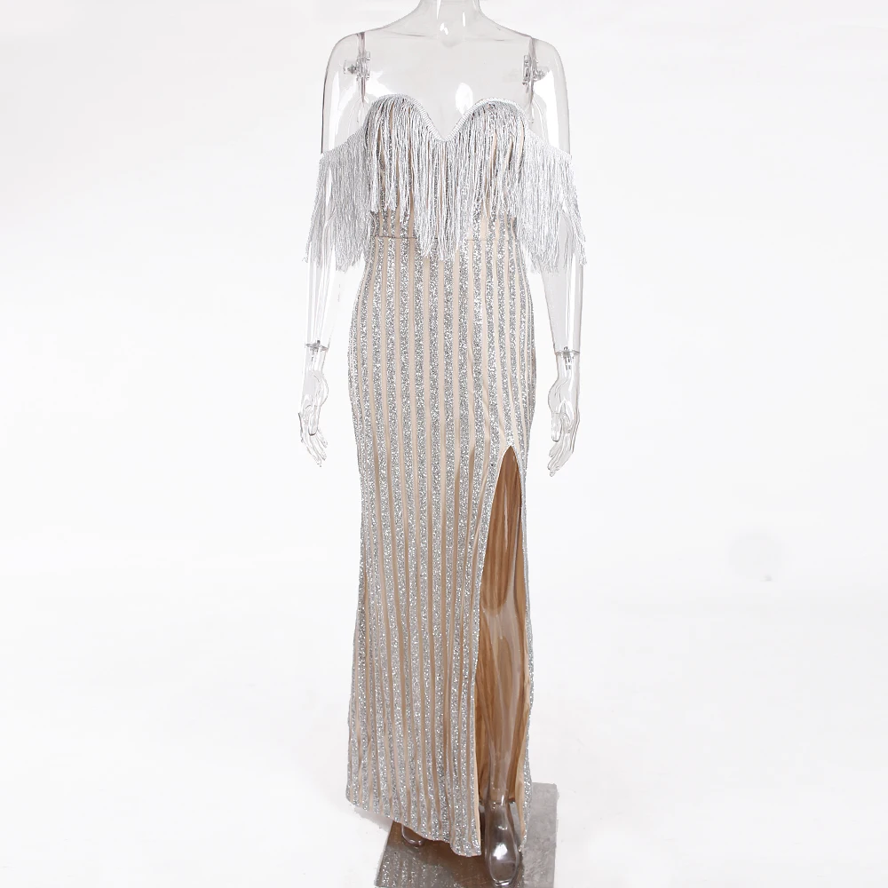victoria’svogue 2021 Glittered Slit Side Sexy Maxi Dress Tassel Off The Shoulder Sleeveless Patchwork Hollow Out Evening Party Dresses