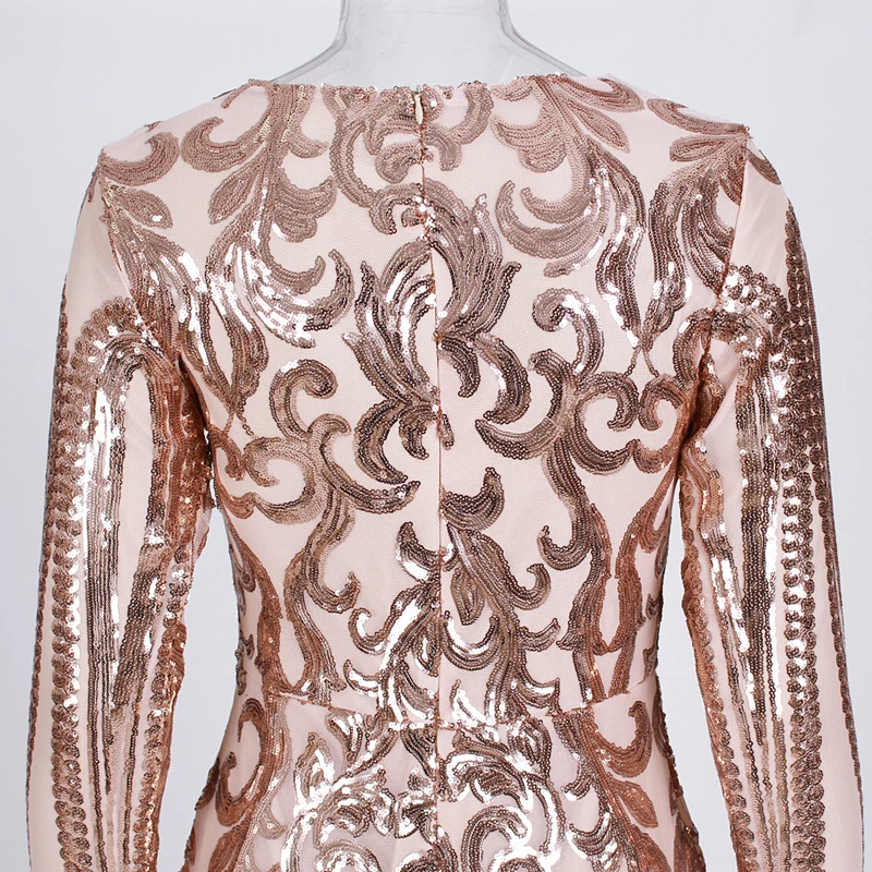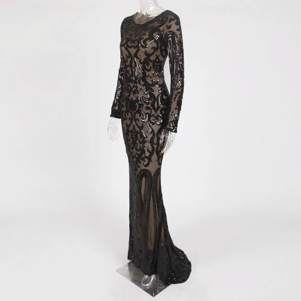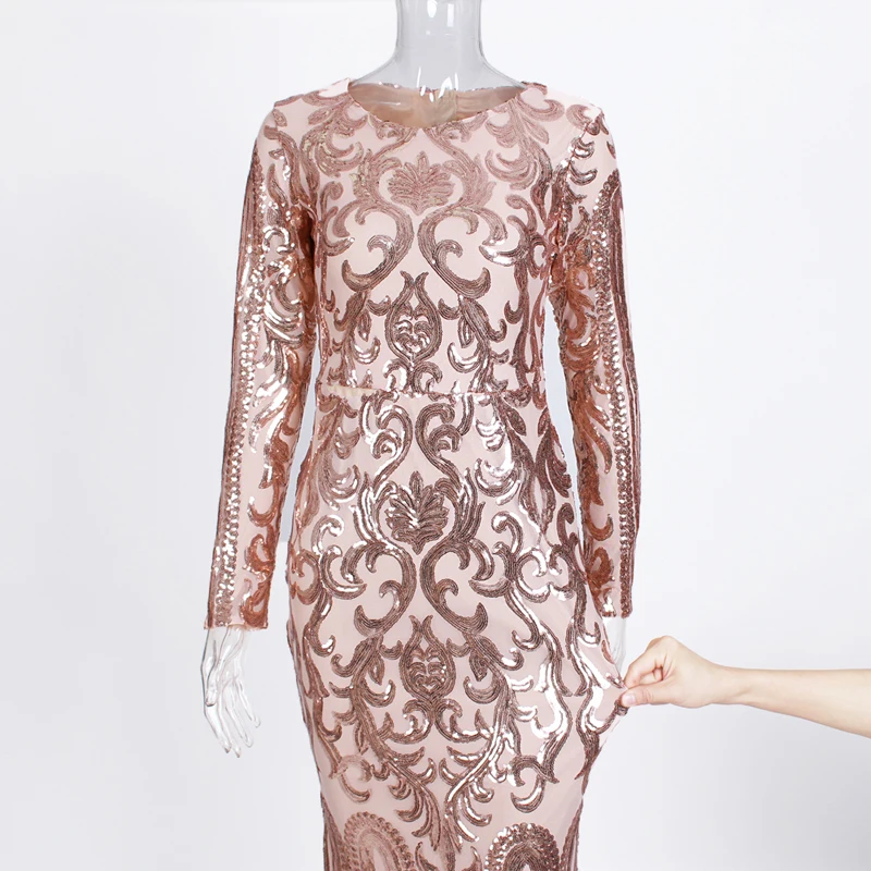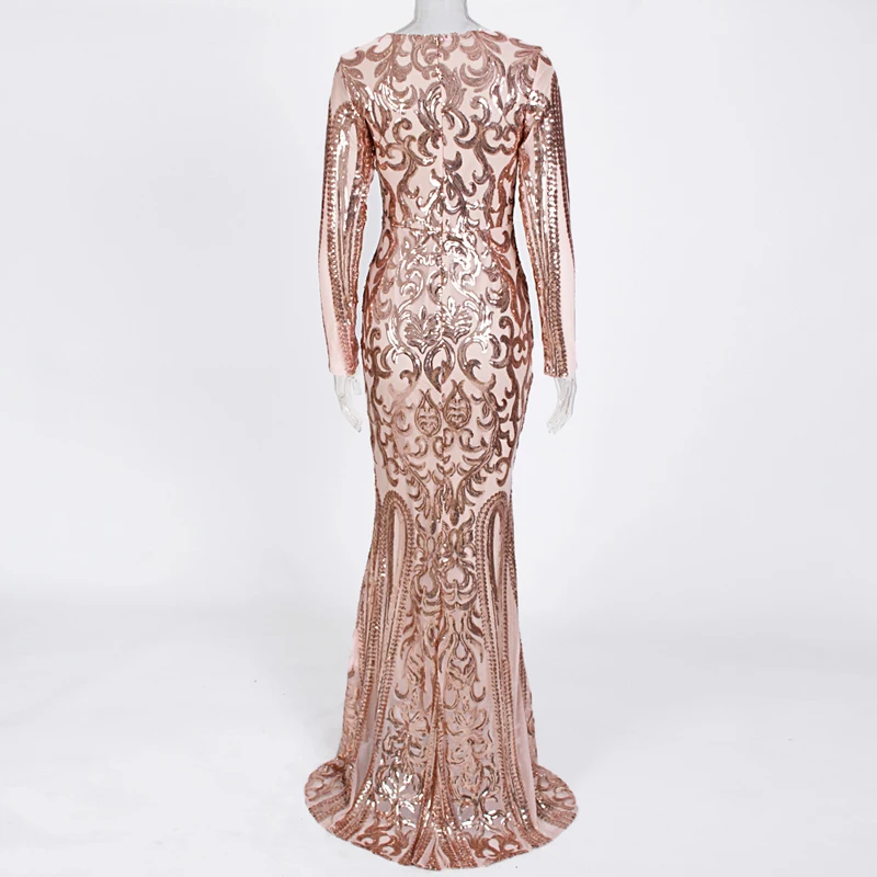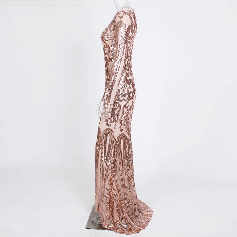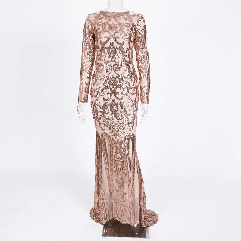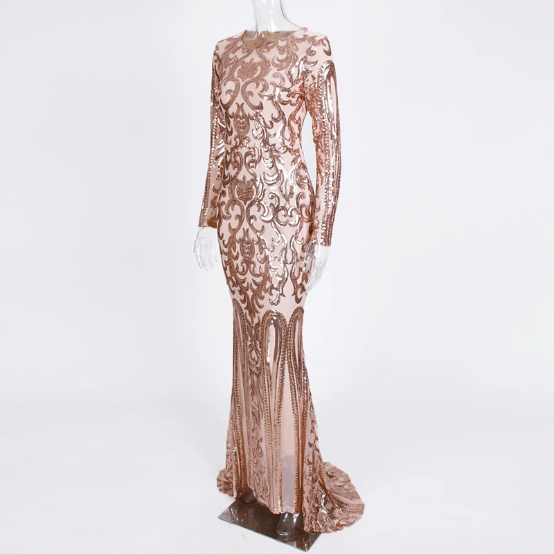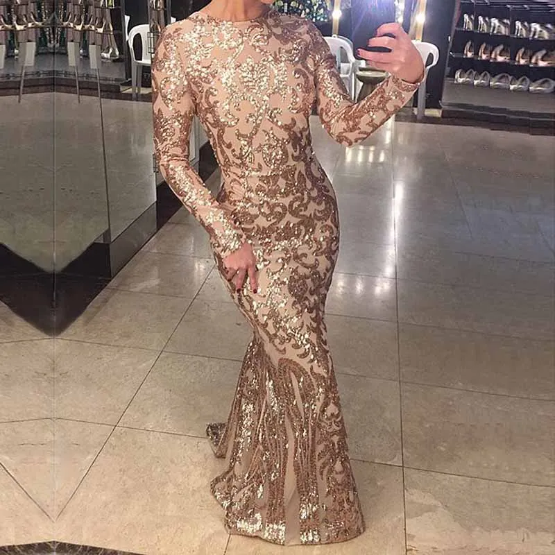 victoria’svogue 2021 Gold Elegant Sequined Vestido Full Sleeved Party Dress Floor Length Bodycon Maxi Dress Evening Gown