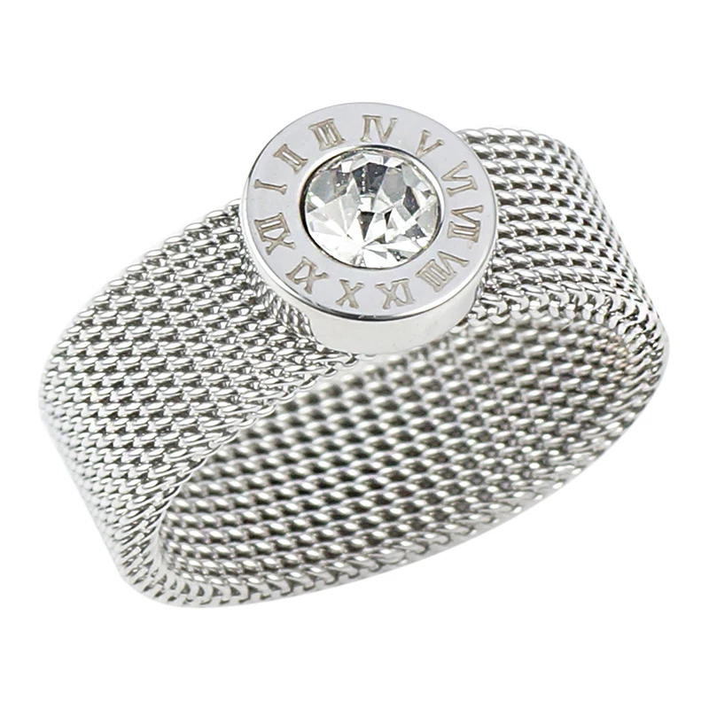 victoria’s vogue Gold Silver Color Stainless Steel Ring Big Round Crystal Mesh Finger Ring Roman Numerals Rings Round Titanium Ring for Women Men