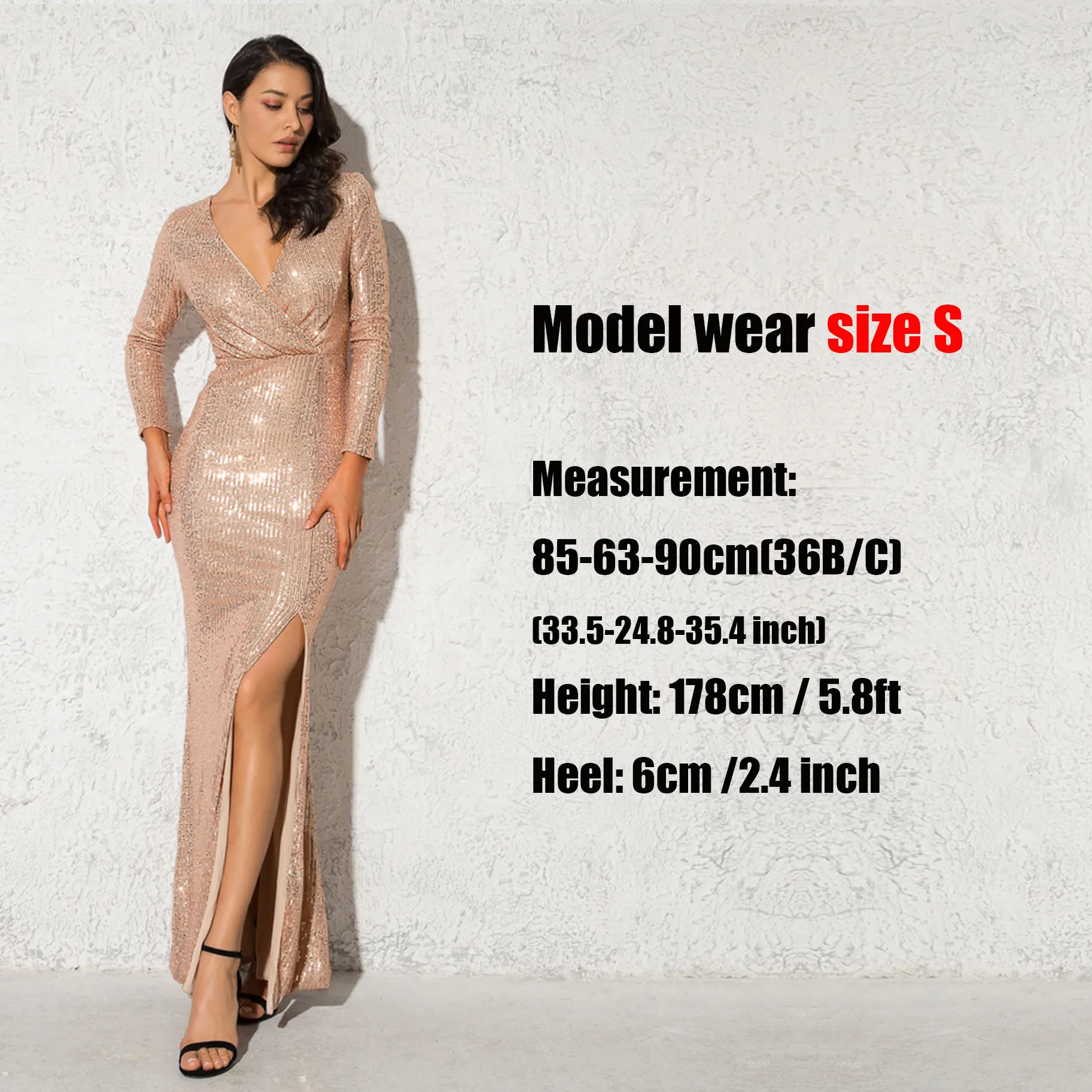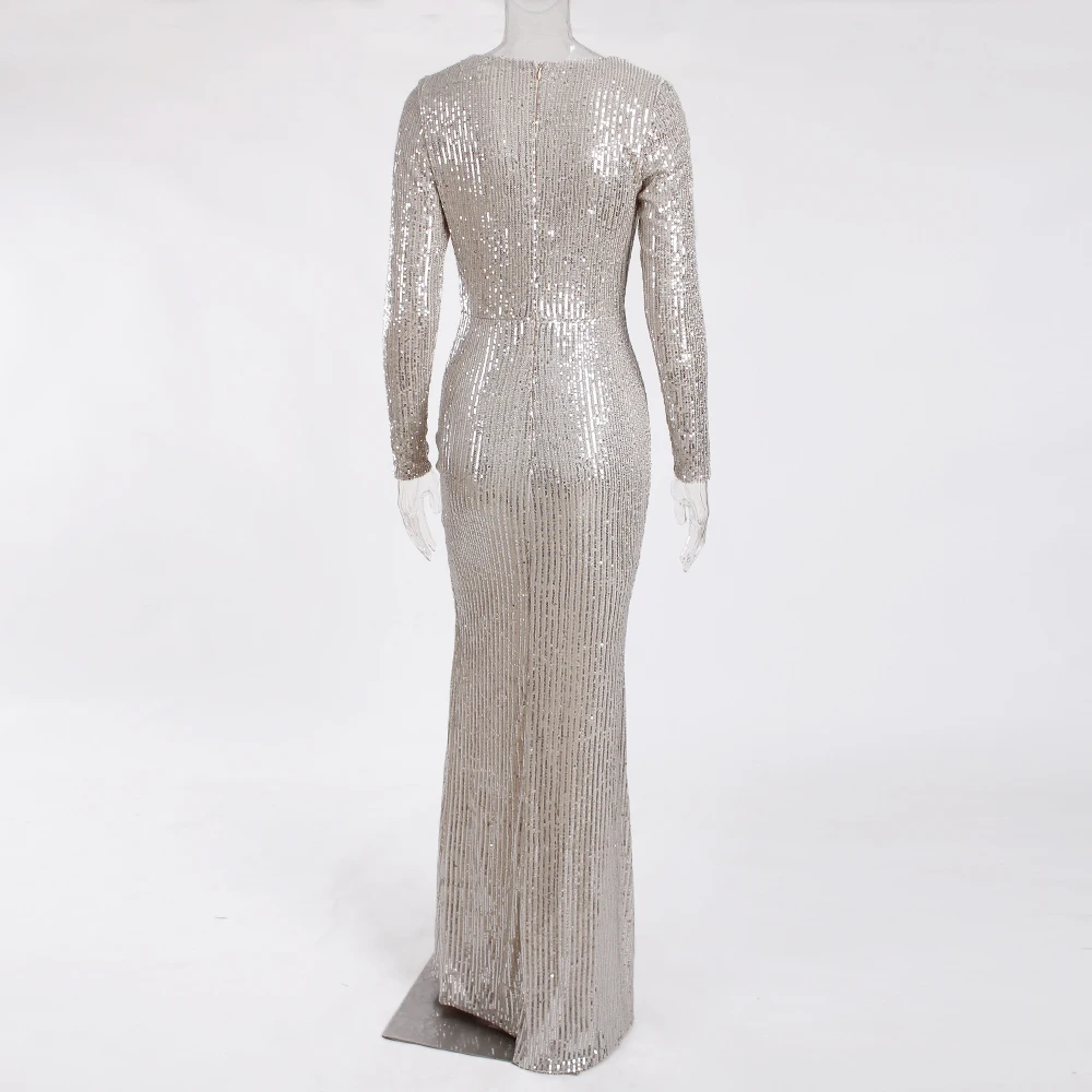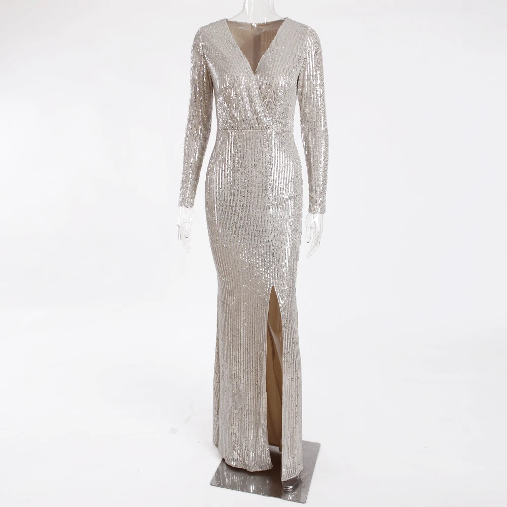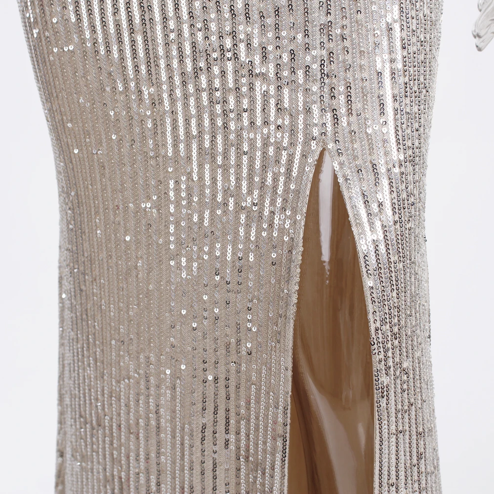 victoria’svogue 2021 Square Collar White Sequined Long Modest Evening Party Gown Maxi Dress Elegant Floor Length Full Sleeved Gold Stretchy Striped Sequin Long Sleeve Maxi Dress V Neck Pleated Leg Split Bodycon Lining Stretchy Green Beige Party Dress