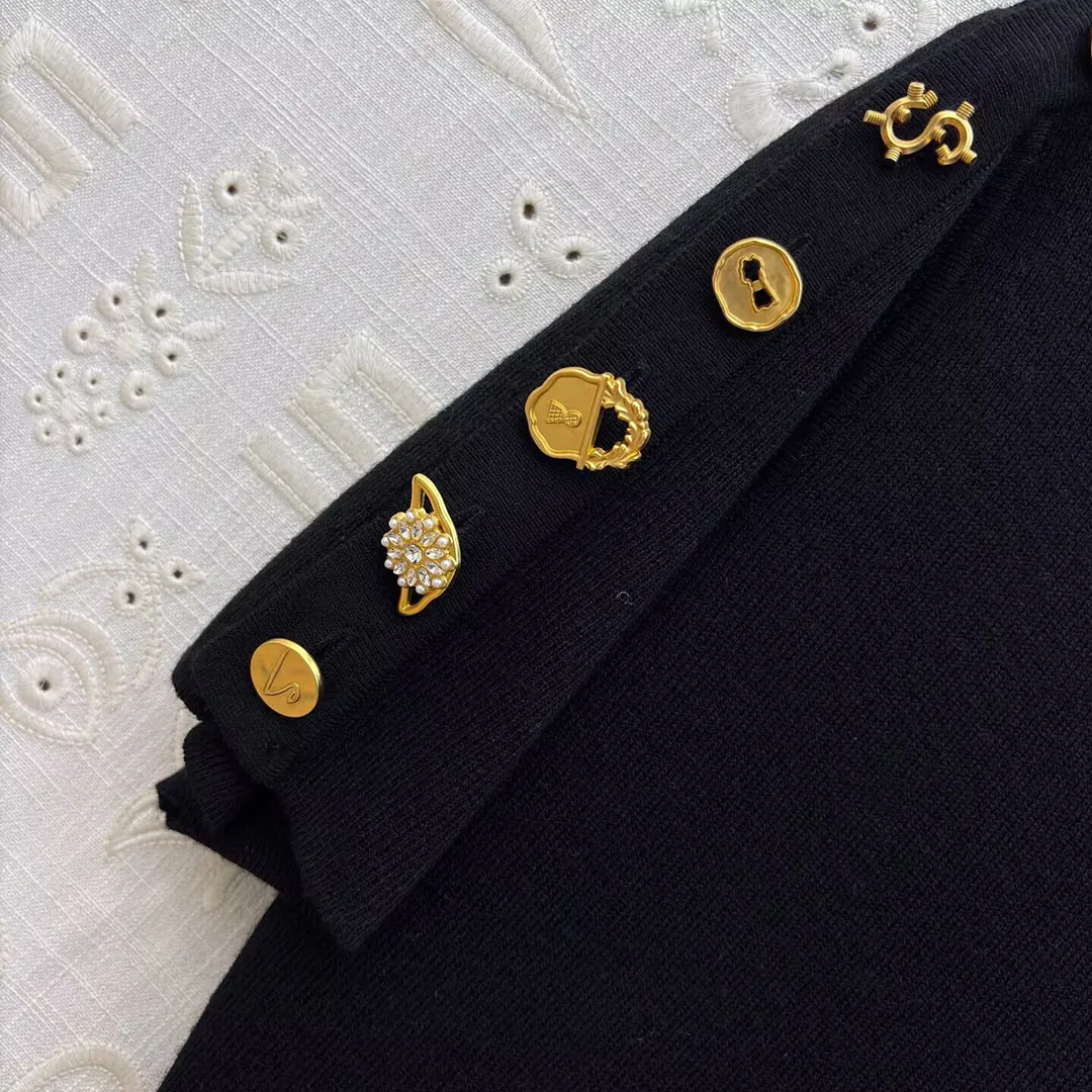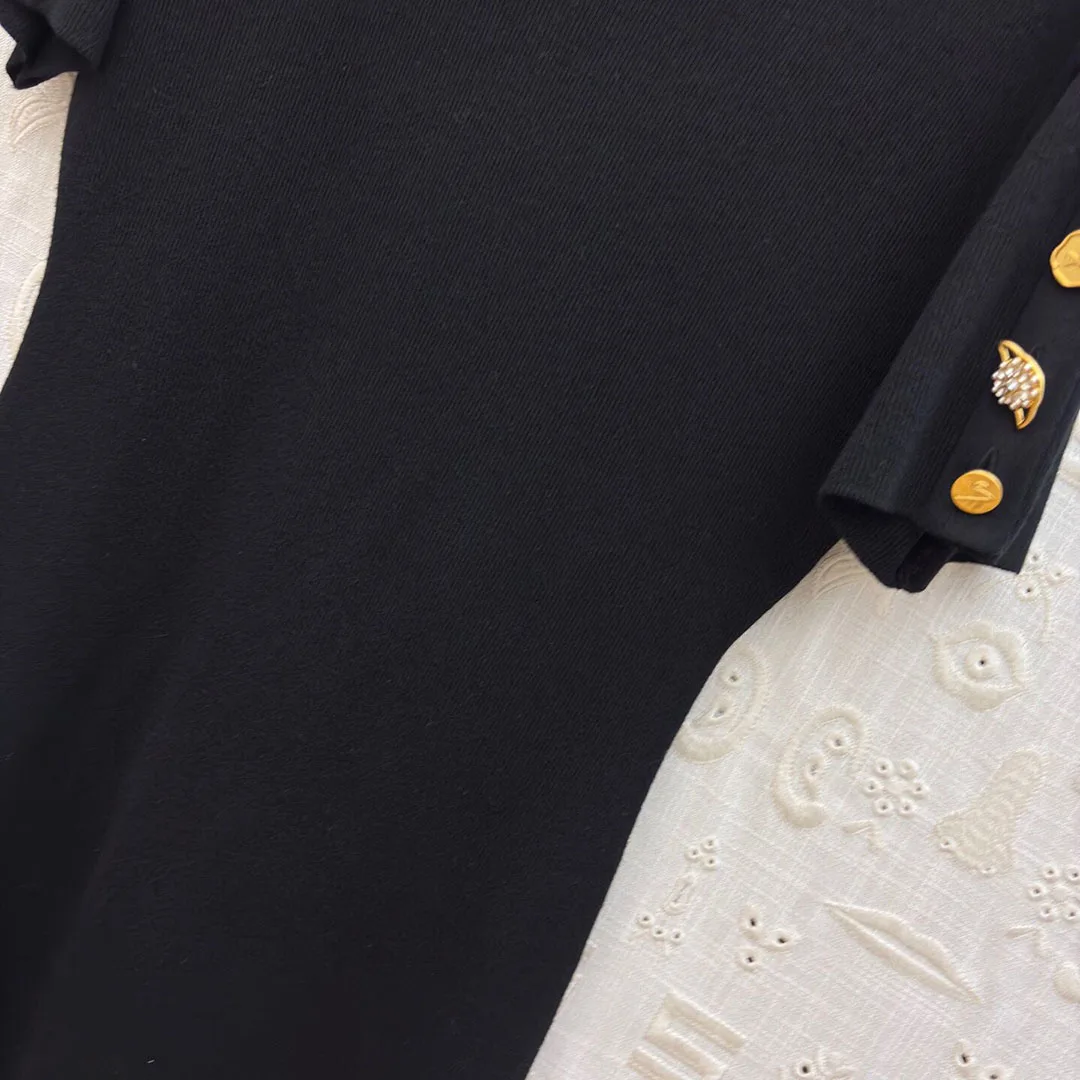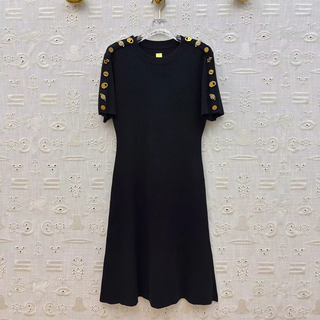 Victoria’s Vouge High Quality Luxury Gold Metal Buttons Short Sleeve Black Knitted Dress Women O-neck A-line Style Elegant Lady Vintage Dresses
