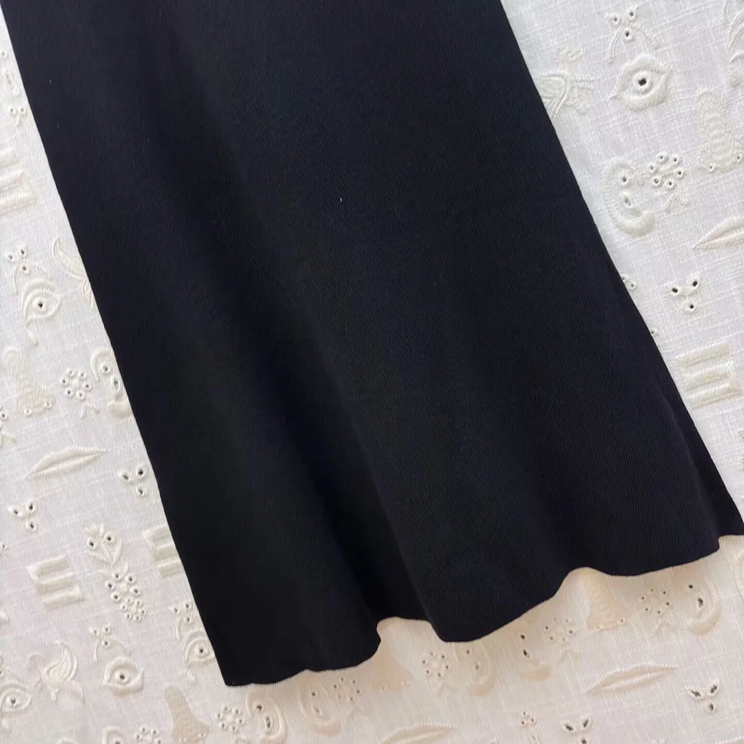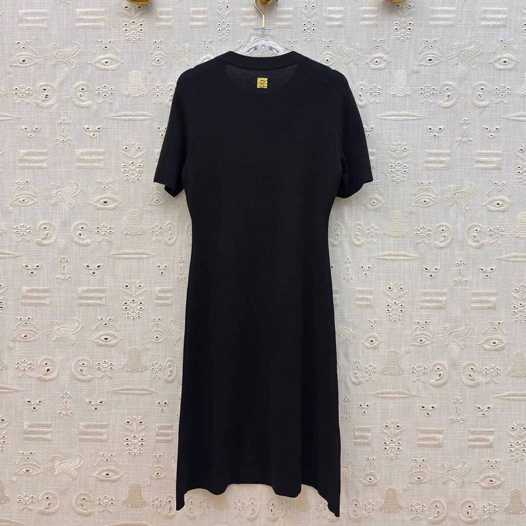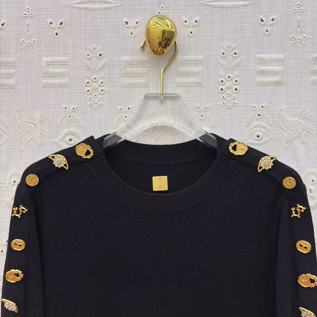 Victoria’s Vouge High Quality Luxury Gold Metal Buttons Short Sleeve Black Knitted Dress Women O-neck A-line Style Elegant Lady Vintage Dresses