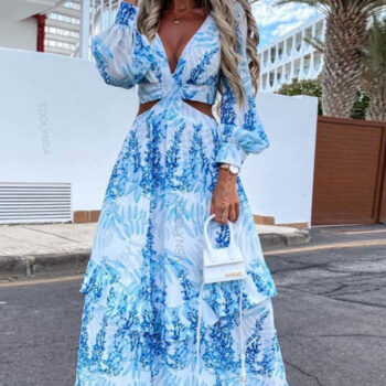 victoria’s vogue Sexy V-Neck Backless Hollow Out Dress Summer Women Long Lantern Sleeve Club Party Long Maxi Dresses