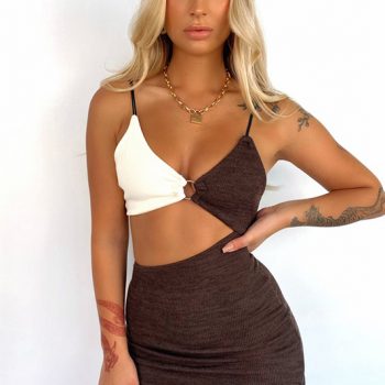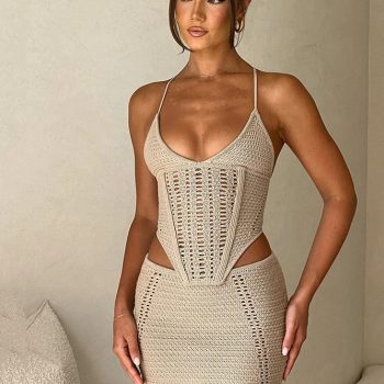 Victoria’s vouge Knitted Sexy See Through Women Two Piece Sets Khaki Spaghetti Strap Top Mini Skirt Summer New Vacation Elegant Skirt Set