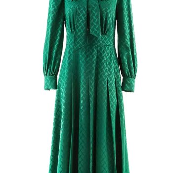 Victoria’s Vogue Women Elegant Pleated Long Dress High Quality Fashion Green Large Swing Bow Collar Buttons Long Sleeve High Waist Holiday Dress
