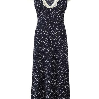 Victoria’s Vogue 2025 Women Navy Blue Polka Dot Long Dress Lace Trim V Neck Short Sleeve A-line Elegant Holiday Dresses Summe Maxi Robe