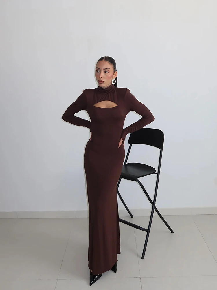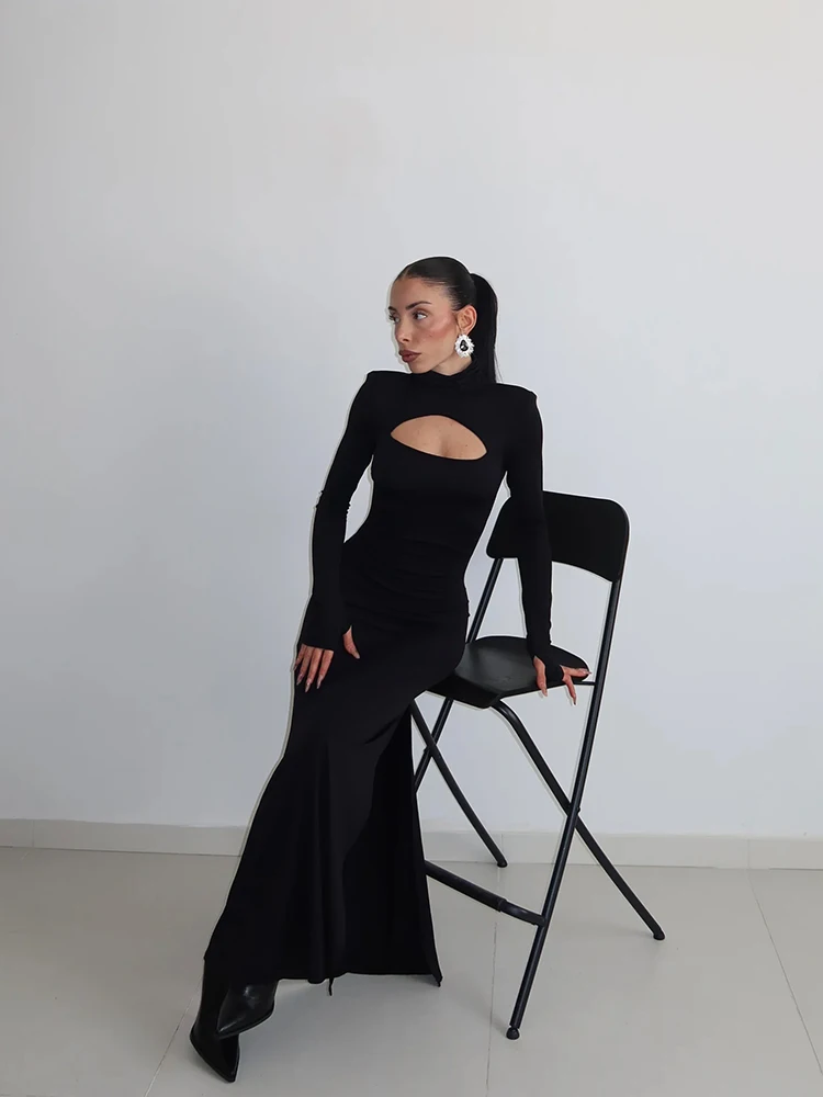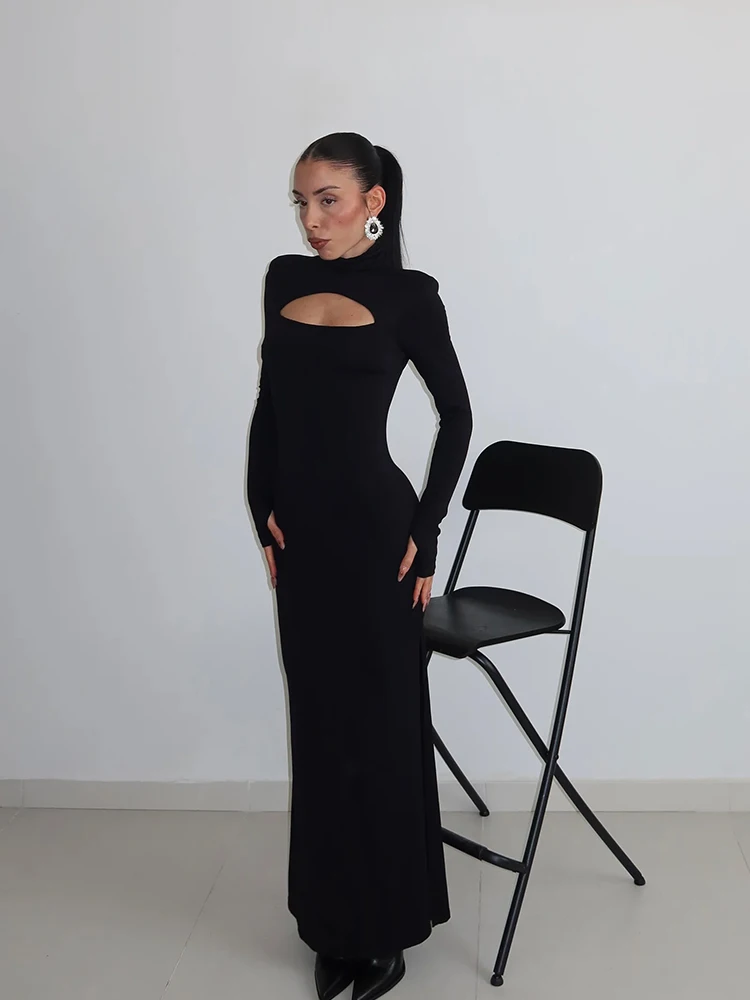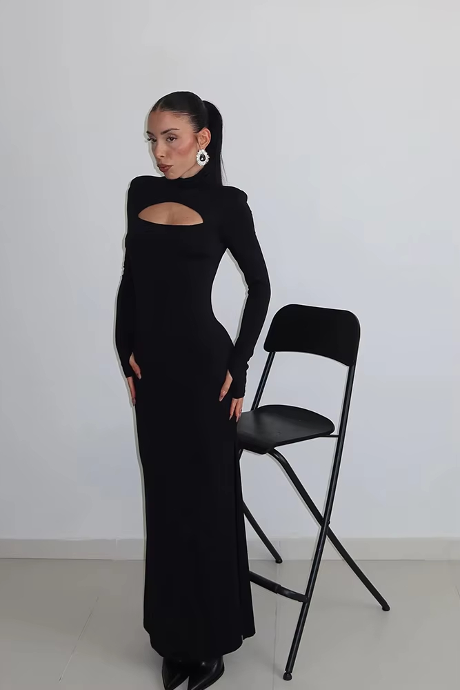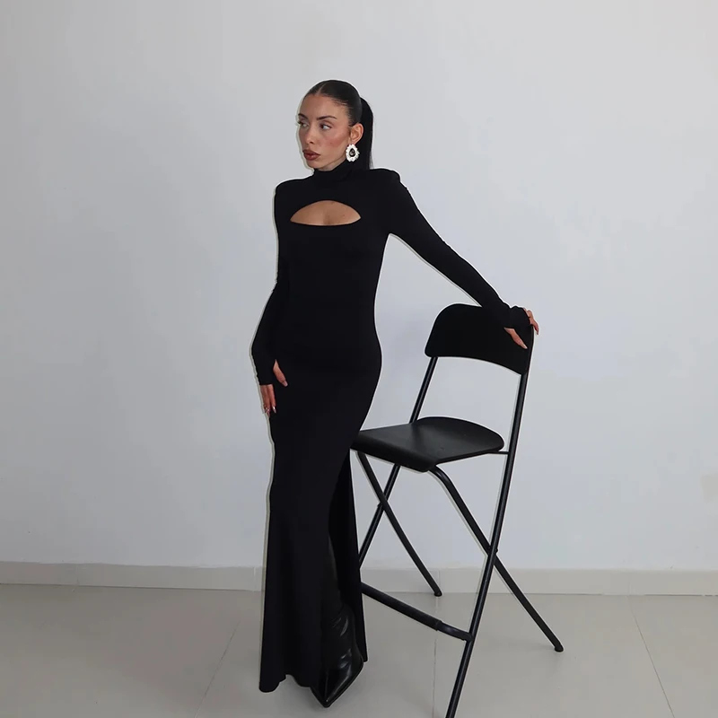 Victoria’s Vogue Sexy Sheath Women’s Maxi Dresses Solid Turtleneck Regular Long Sleeves Hollow Out Slim Fit Bodycon Party Vestidos Robes