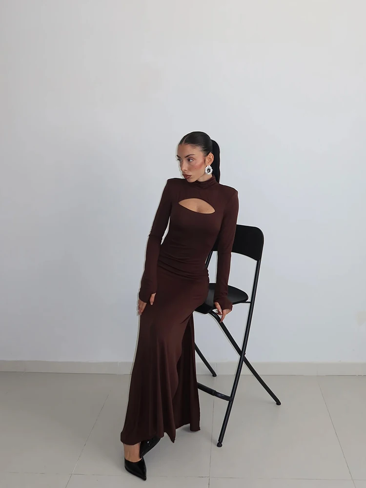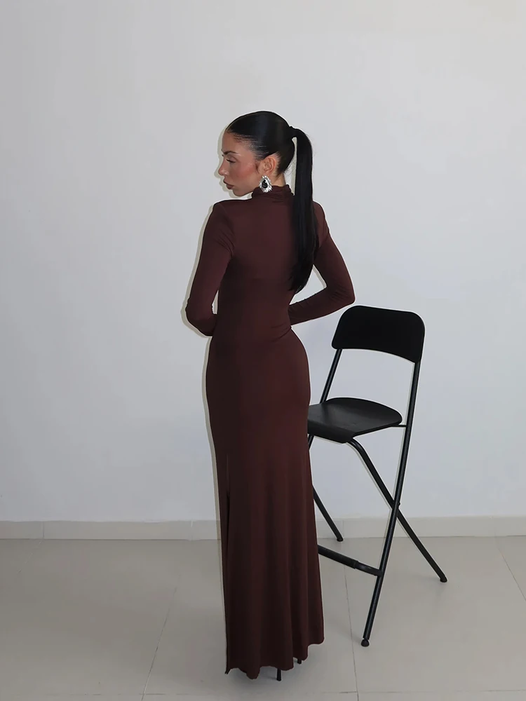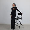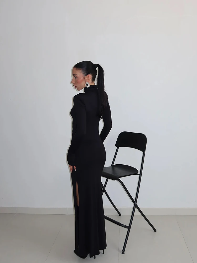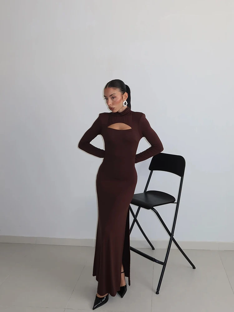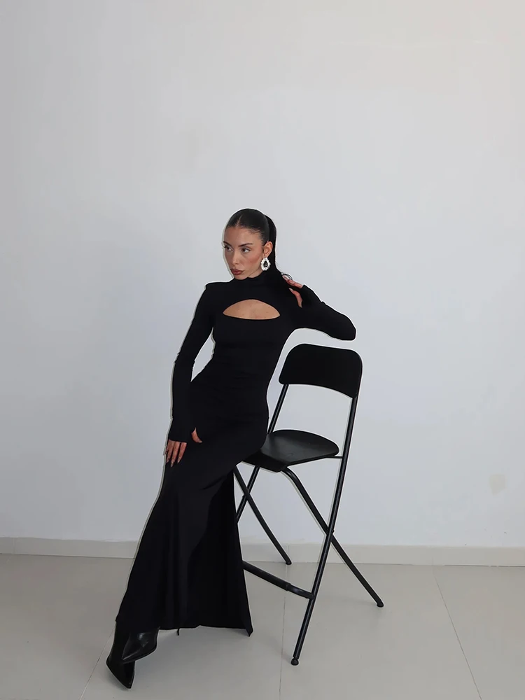 Victoria’s Vogue Sexy Sheath Women’s Maxi Dresses Solid Turtleneck Regular Long Sleeves Hollow Out Slim Fit Bodycon Party Vestidos Robes