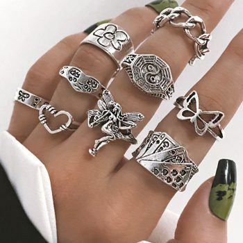 victoria’s vogue Punk Lady Stylish New Angel Skull Heart Flower Rings for Women Men Hip Hop Exaggerated Silver Color Finger Rings