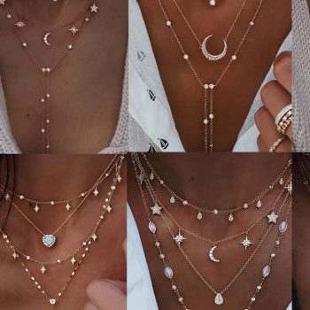 Victoria’s Vogue New Vintage Crystal Geometry Star Moon Lock Necklace For Women Boho Multi-level Pendants Necklaces Chokers Jewelry Gift