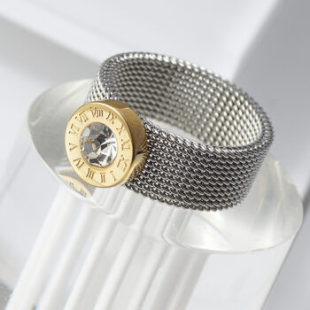victoria’s vogue Gold Silver Color Stainless Steel Ring Big Round Crystal Mesh Finger Ring Roman Numerals Rings Round Titanium Ring for Women Men