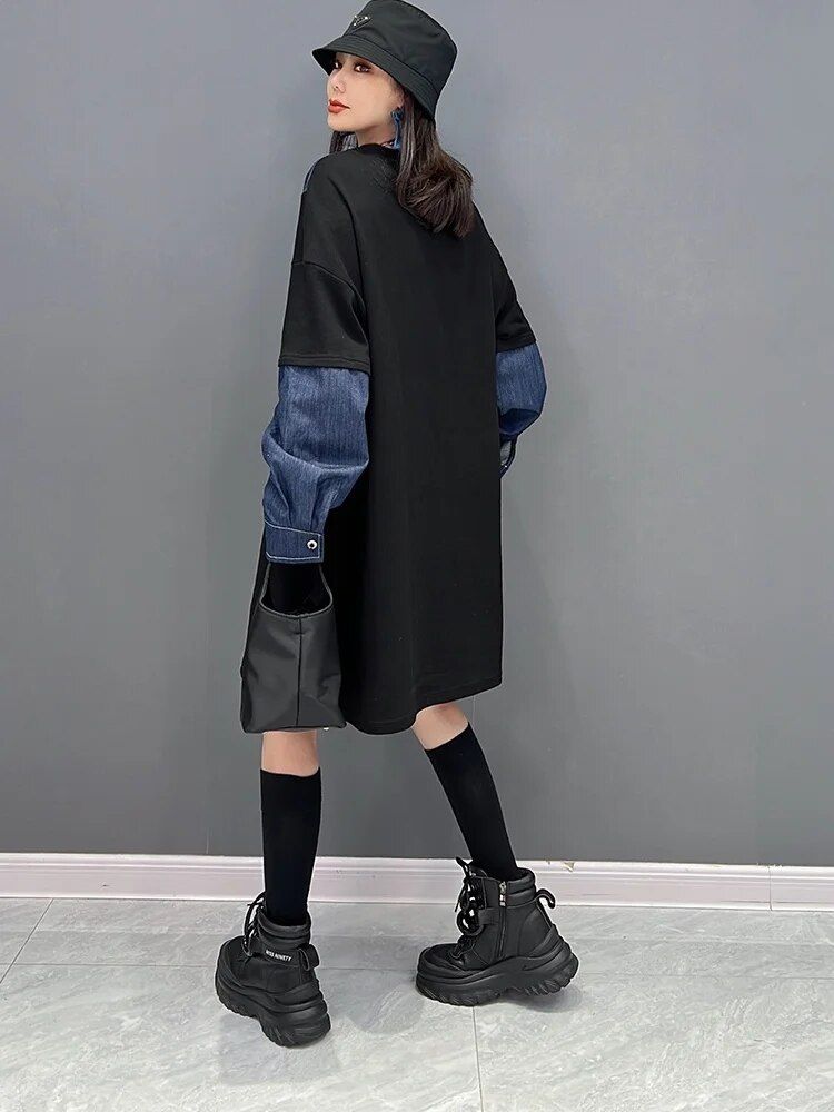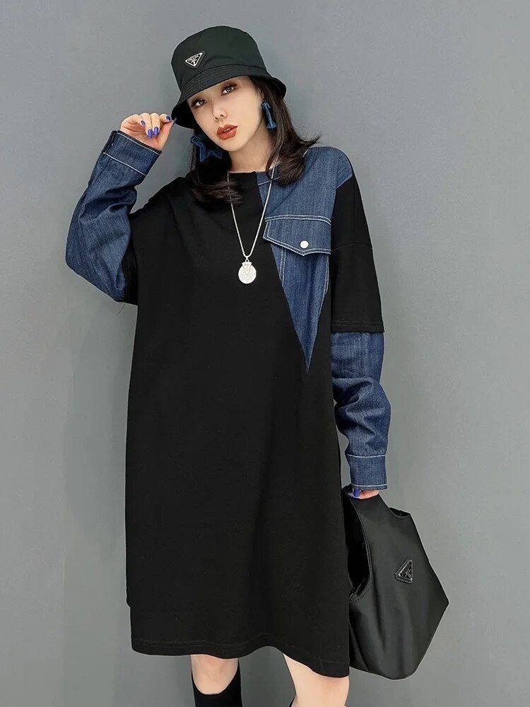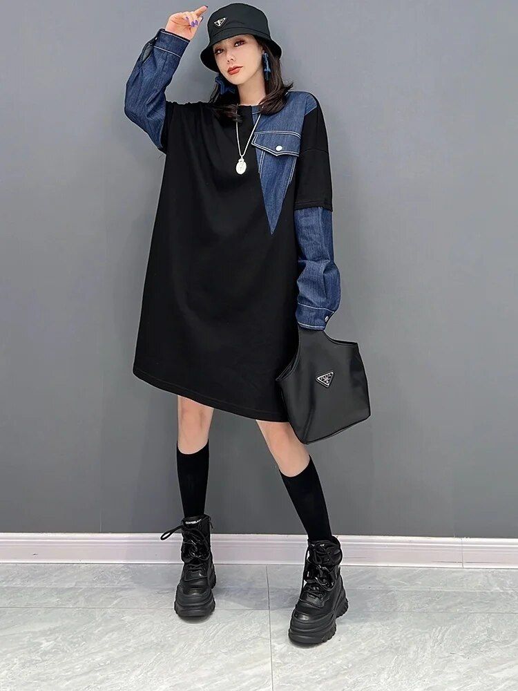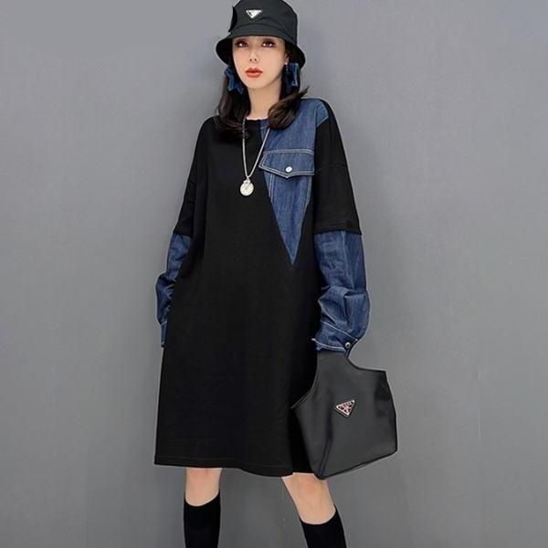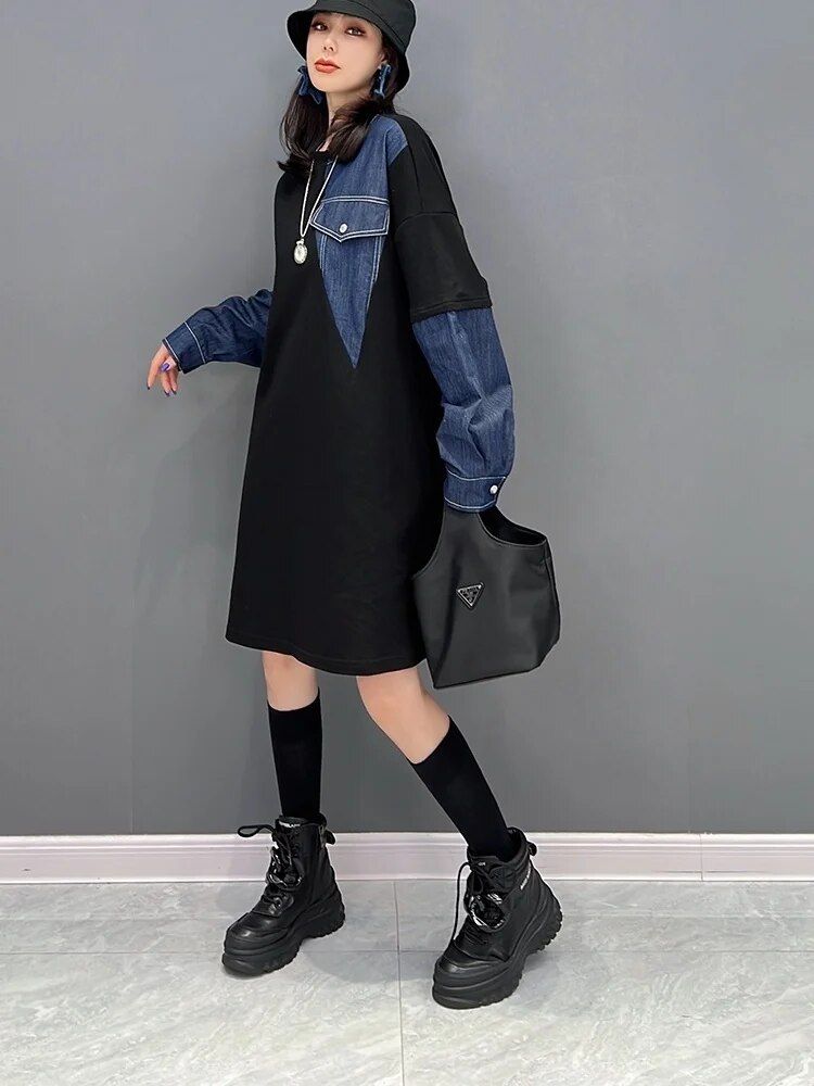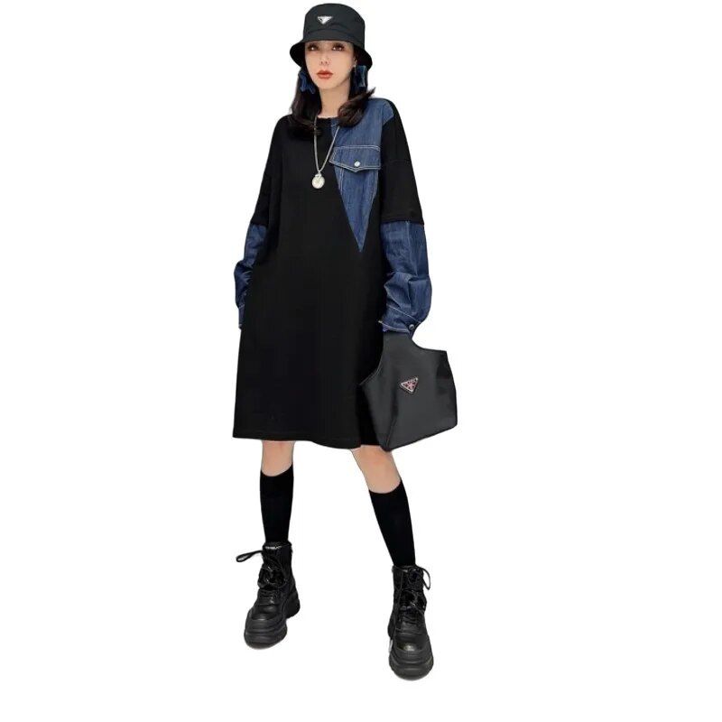Embrace the allure of the season with our latest addition – the Knee-Length Denim Patchwork Dress. Designed for the modern woman, this dress is the quintessence of Korean fashion trends that balance comfort with streetwear chic. Whether you’re stepping out for a casual meet-up or dressing up for a night on the town, this dress is sure to turn heads and spotlight your fashion-forward spirit.