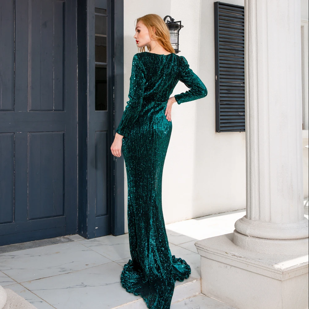 victoria’svogue 2021 Long Evening Mermaid Dress Full Sleeved Square Neck Green Sequined Floor Length Stretchy Bodycon Maxi Dress