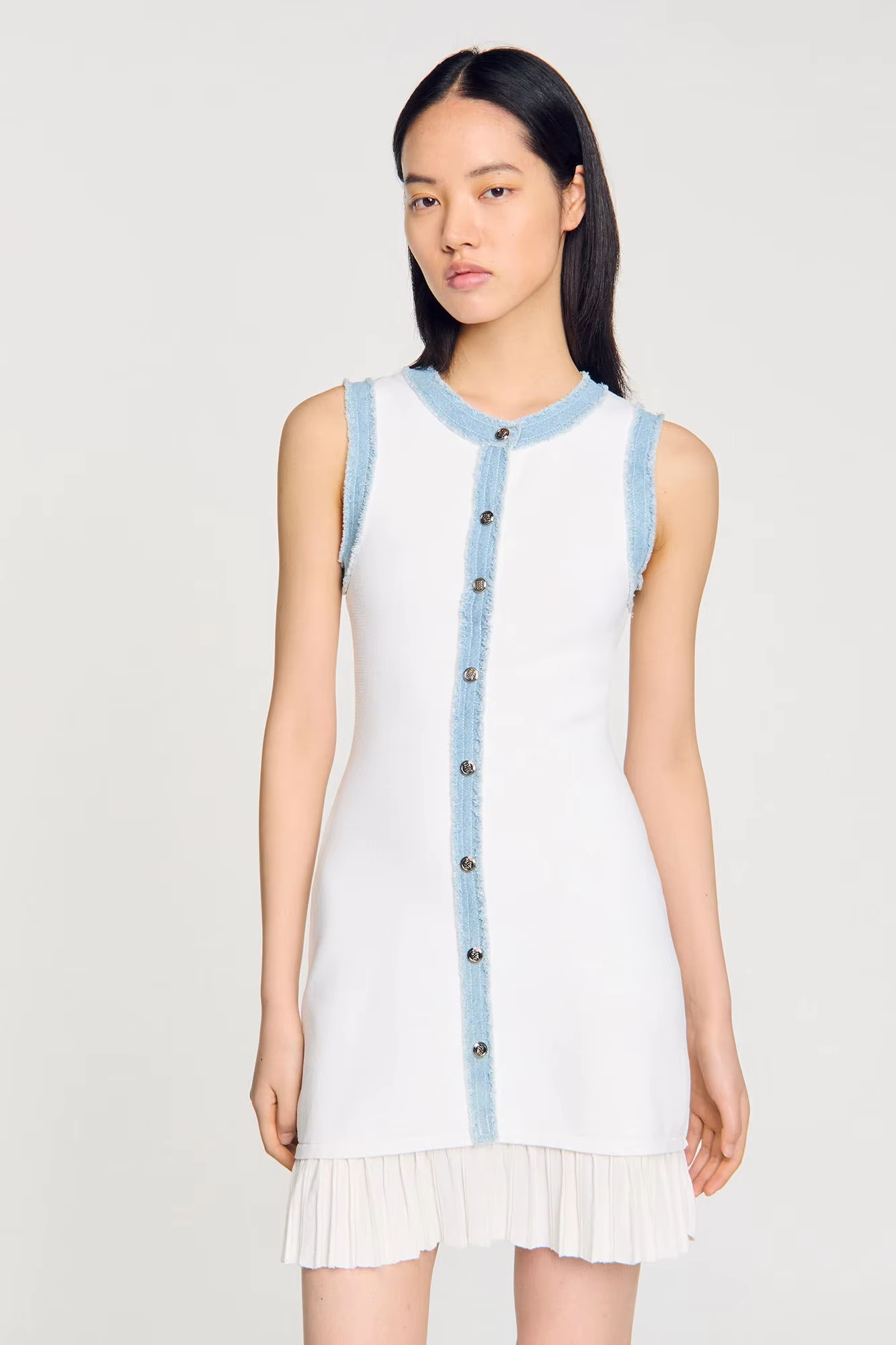 Victoria’s Vogue Design Denim Sleeveless Button O-neck Mini Women Ruffle Chiffon Knitted Dress Slim Fit Elegant Office Lady Clothing