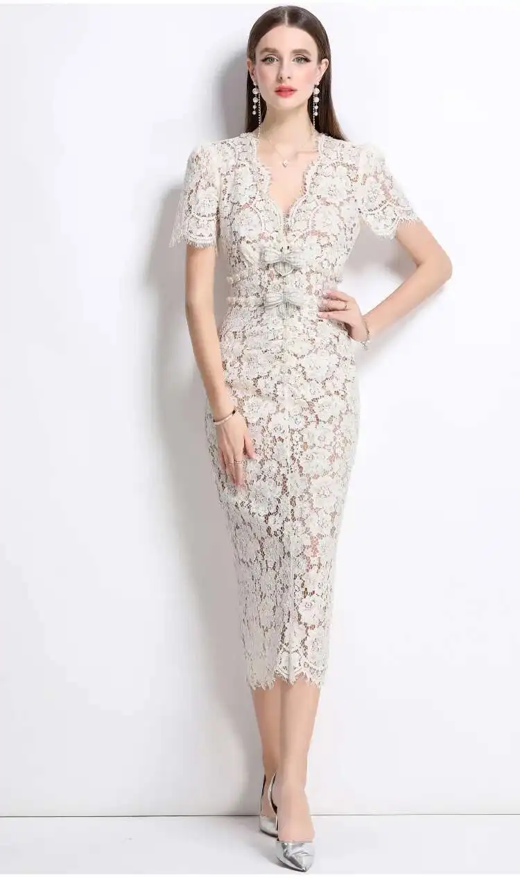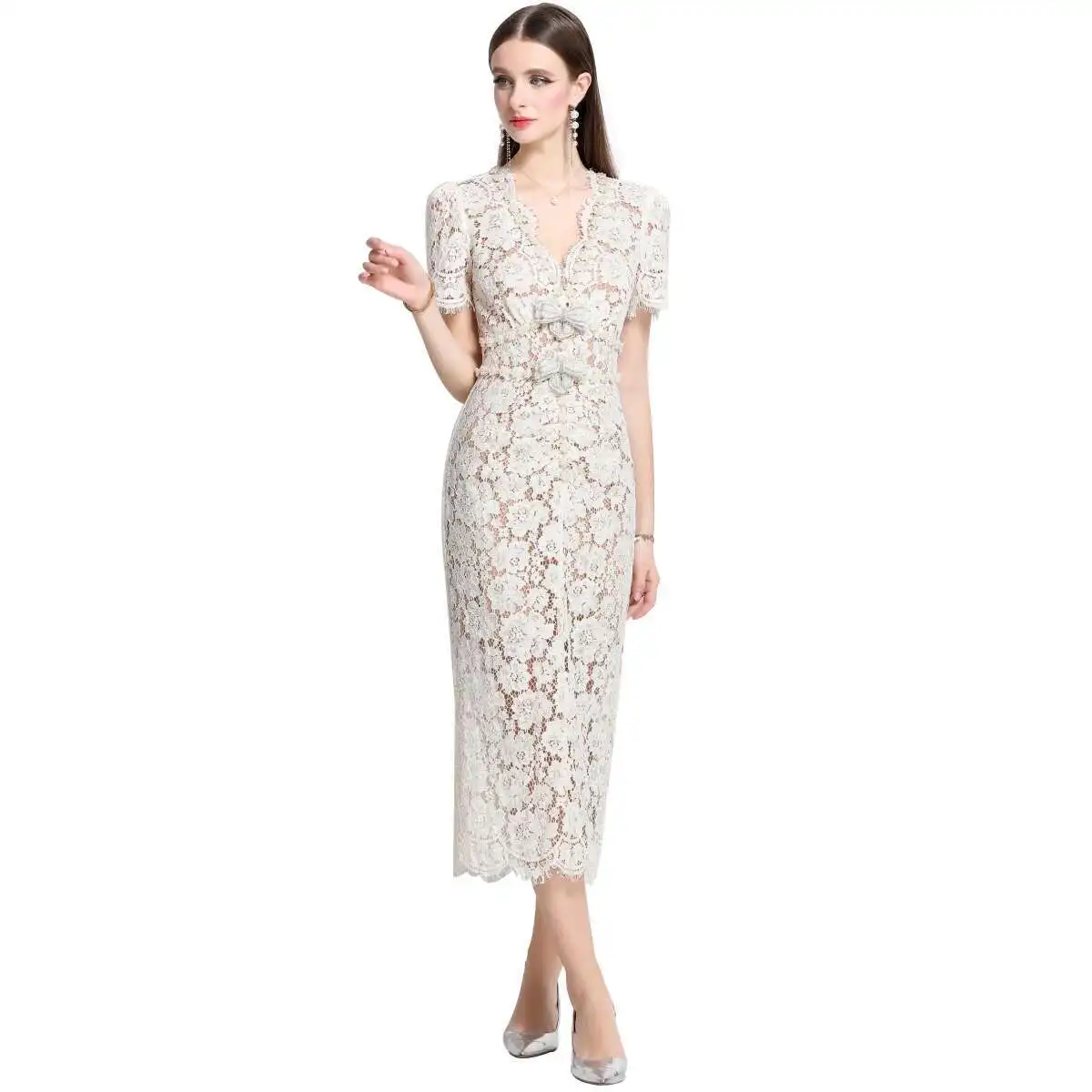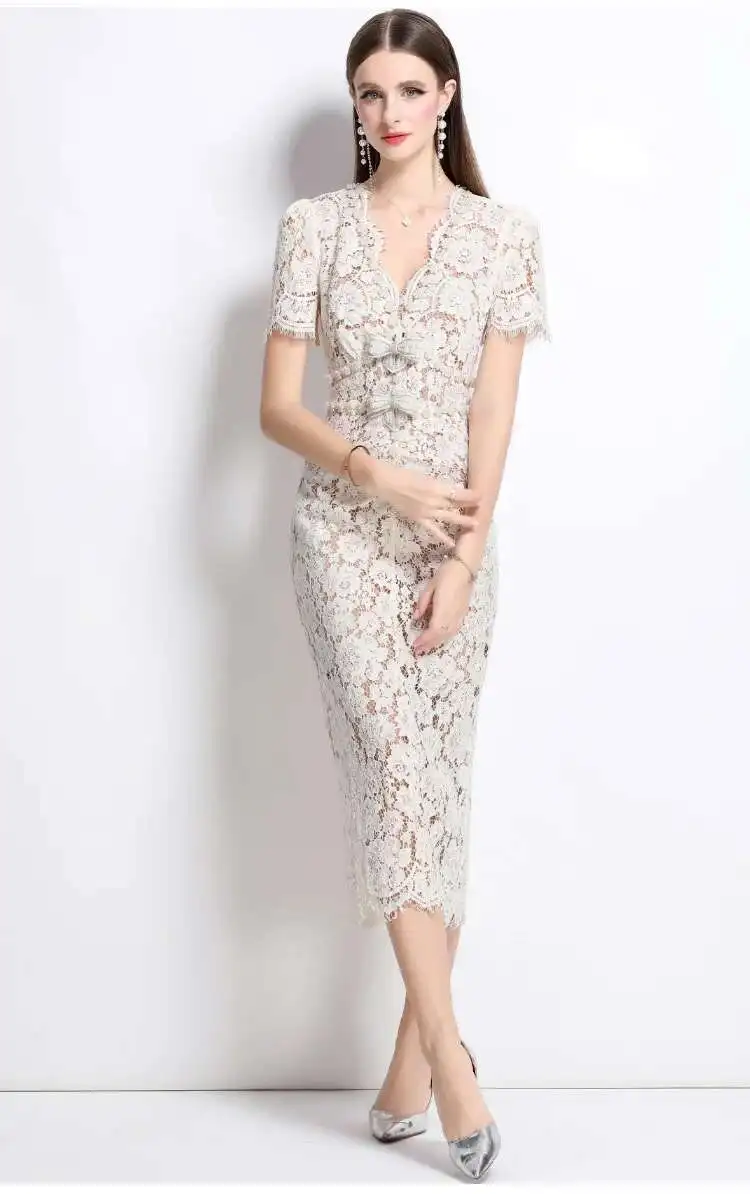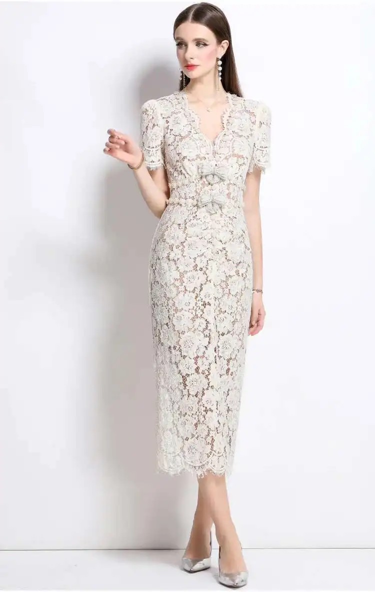 Victoria’s Vogue Crystal Bow Evening Formal Dress Women Summer Elegant Short Sleeve Hollow Out Pearl Embroidery Midi Long Lace Dresses